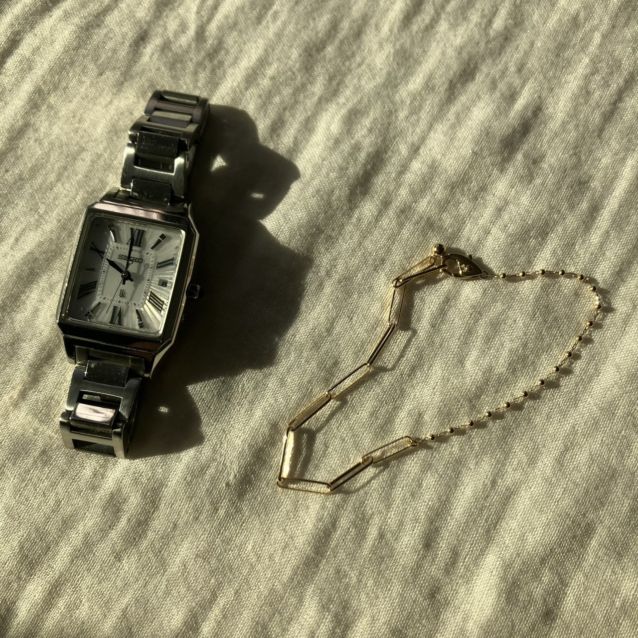 時計はつける派なのですが大きすぎないスクエアフェイスのシンプルな時計は何にでも合いつつどんな場面にも迷わずつけられて気に入っています。
