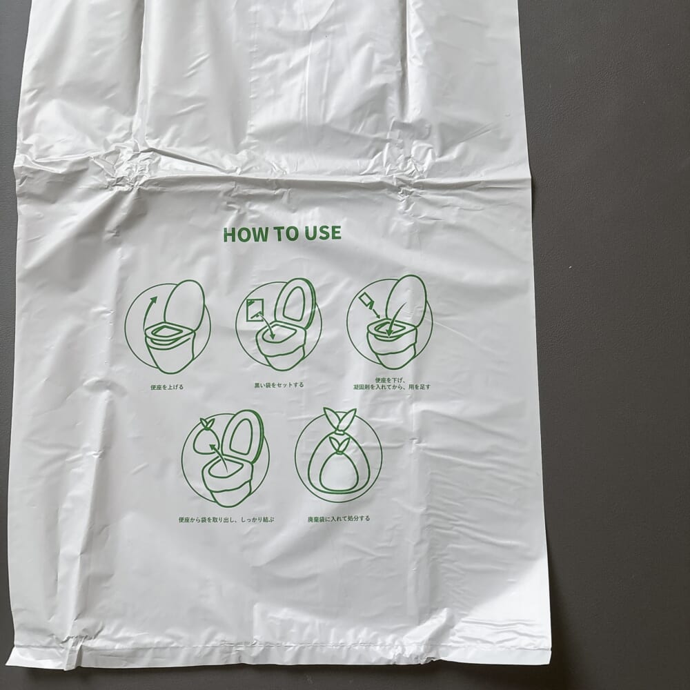 便座から袋を取り出ししっかりと結んだら、先ほど使用方法が書いてあった袋に二重に入れて処分。これならいつもと同じお手洗いをそのまま使えるので安心。