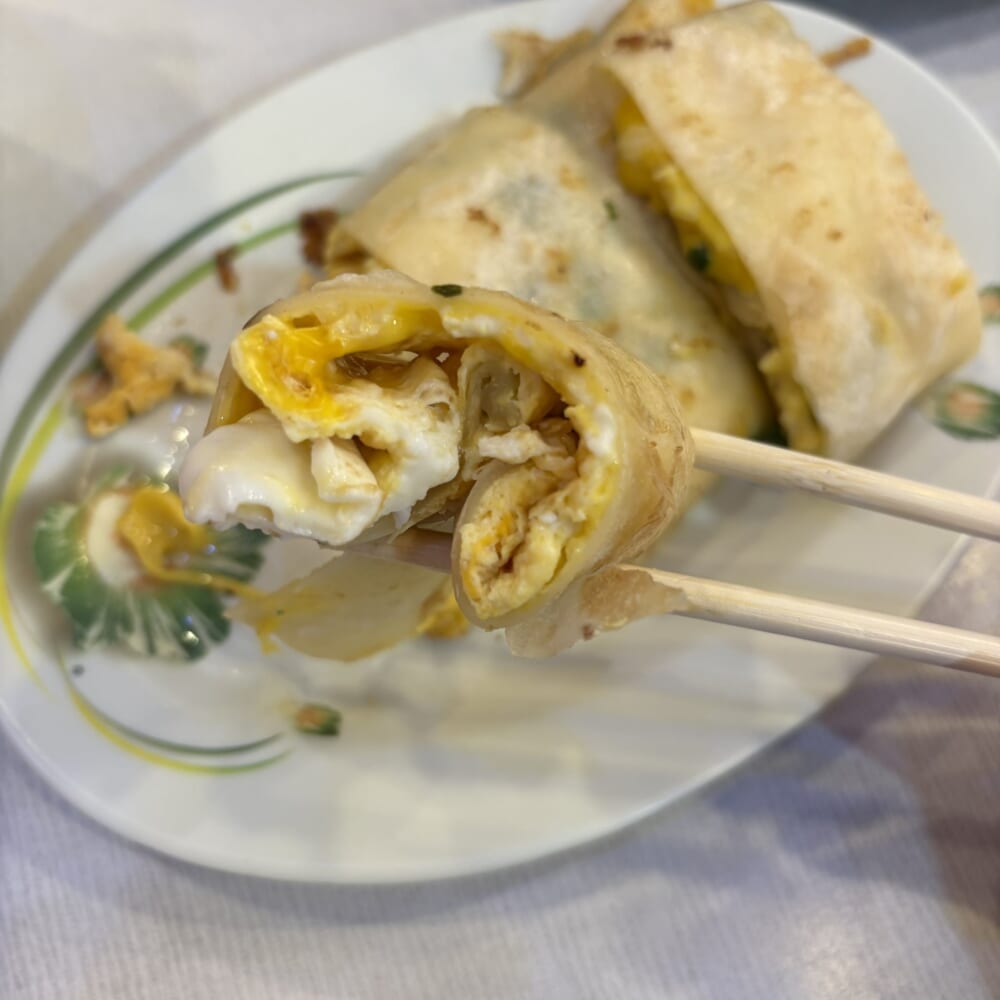 蛋餅は厚めのクレープ生地のような皮に、卵焼きやネギが巻かれたもので、シンプルで素朴な美味しさ。今回はチーズ入りをチョイスしました。