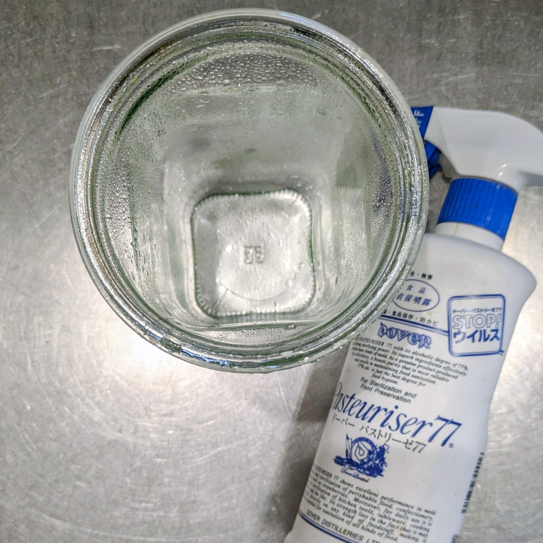 瓶を食品用アルコールスプレーで消毒しておく。