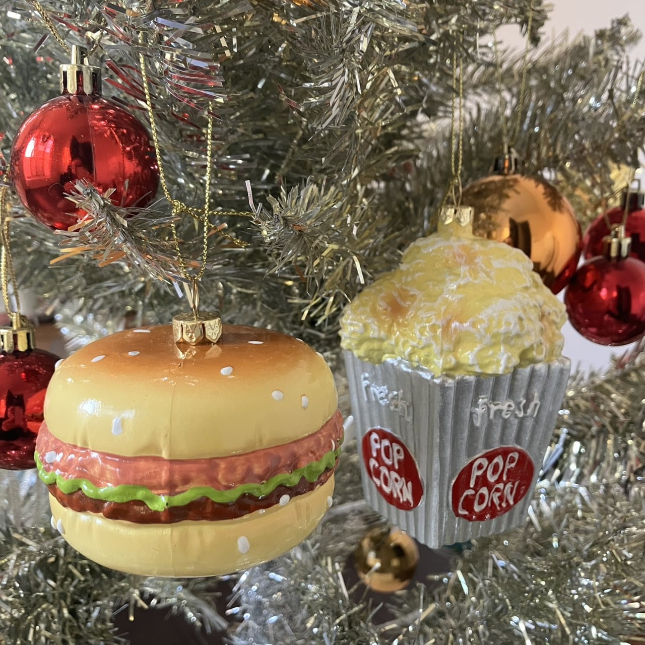 毎年買い足しているオーナメント。今年はハンバーガーとポップコーンに。