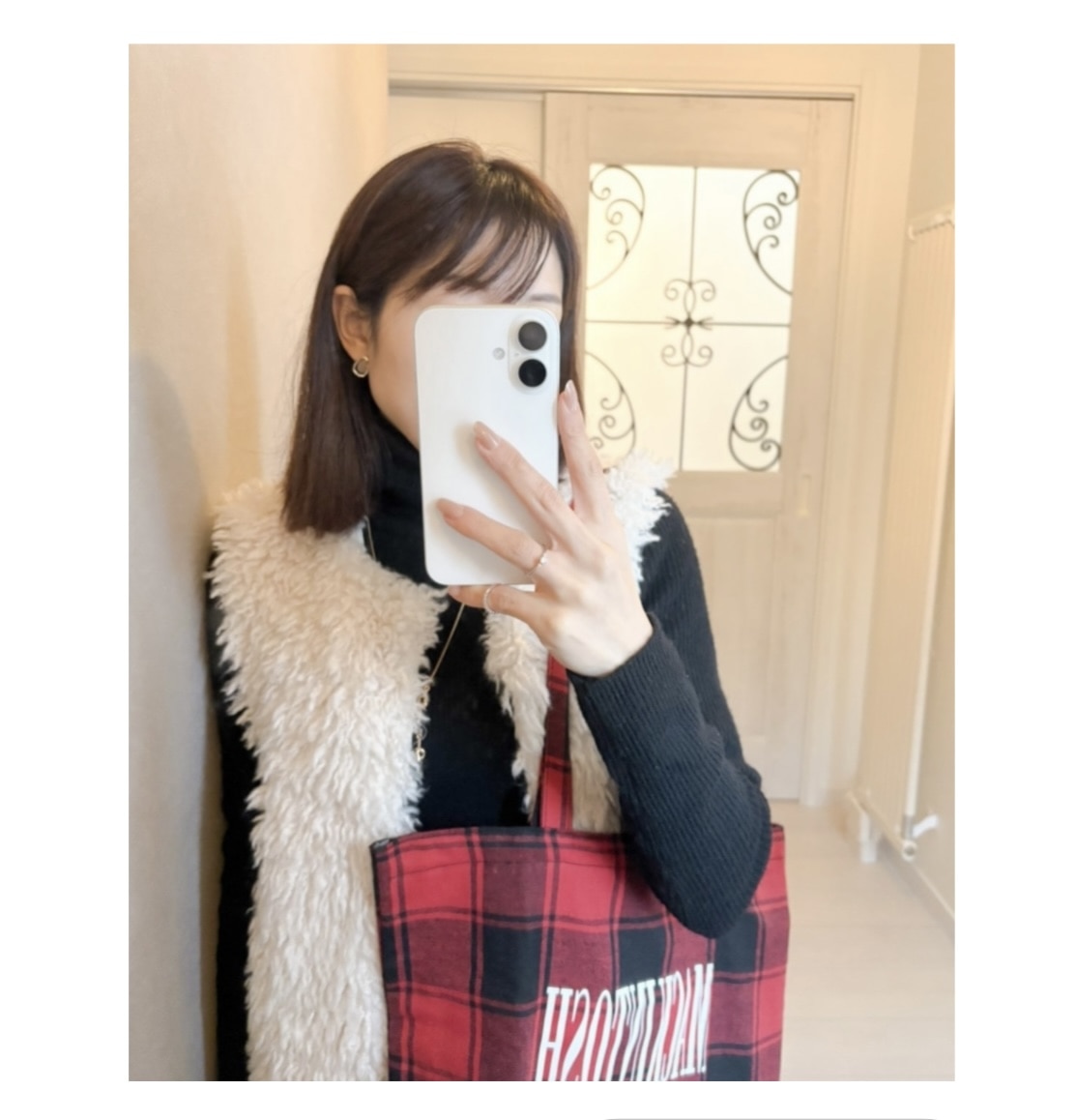 ■【ホワイトファーベスト】で 雪国×赤チェックコーデ