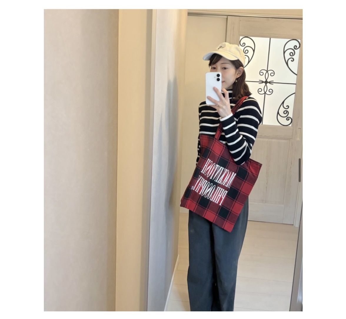 こんな感じで、早速、赤チェックトート×コーデを組んでみました!