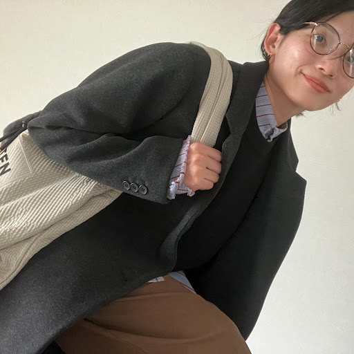 コートのインナーはオーバーサイズのシャツと短丈ニットを。
