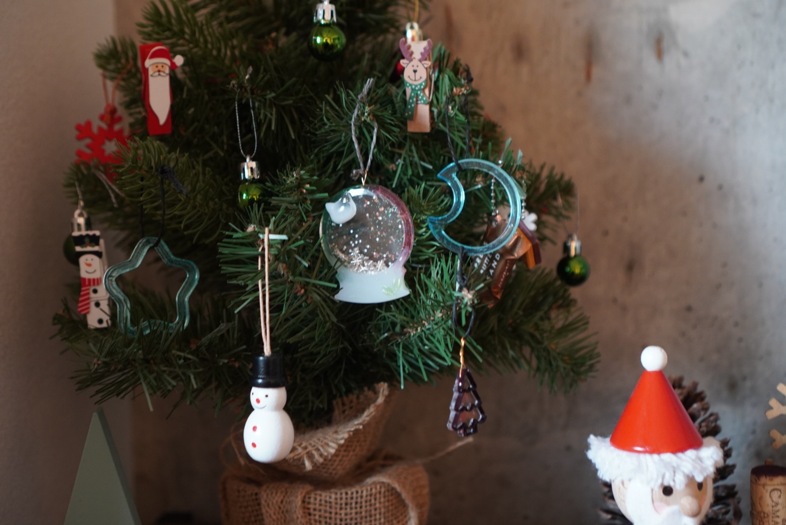 ツリーにはサンタやトナカイの絵が描かれたクリップや、持っているカプセルトイなど、自由に飾ってます。
