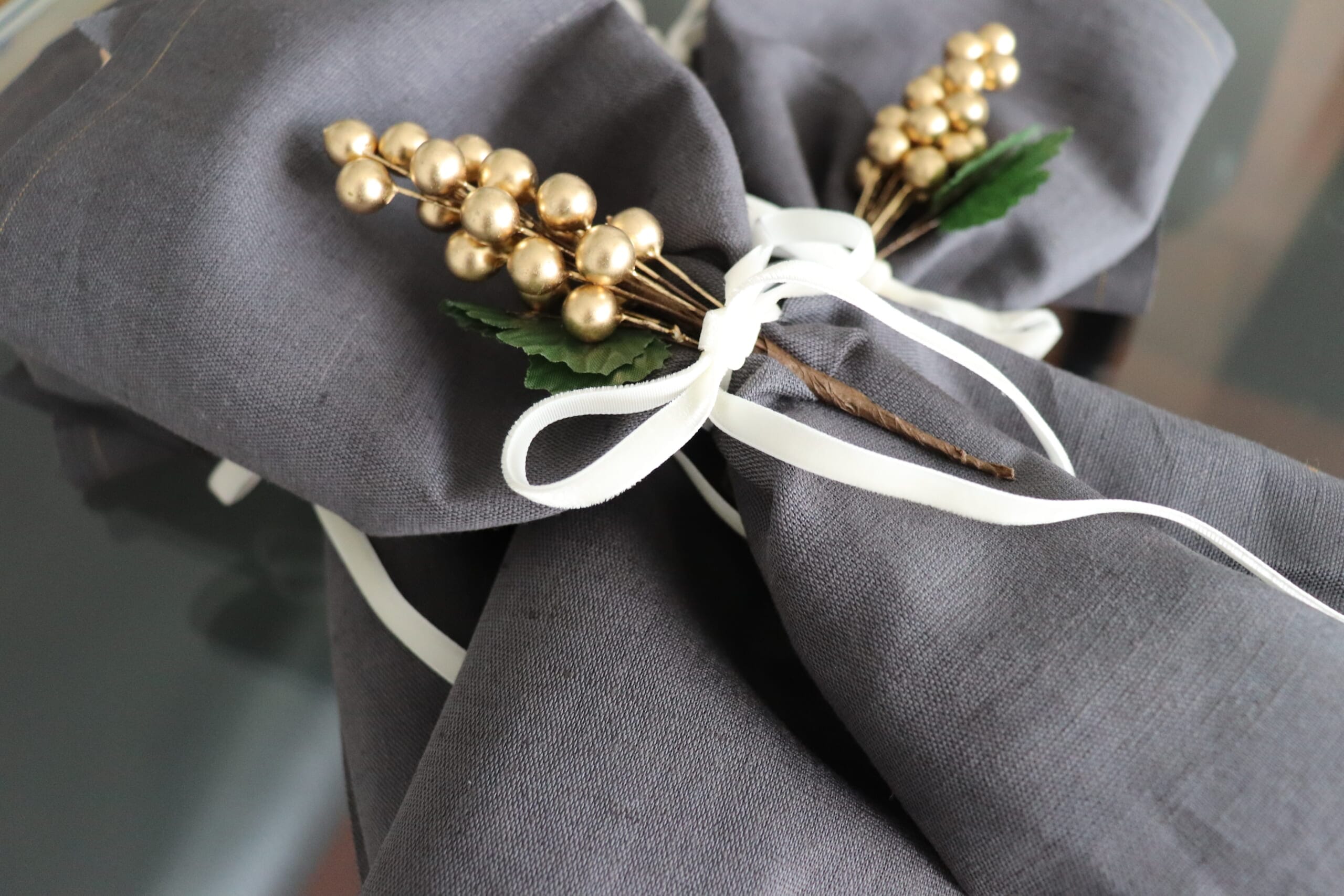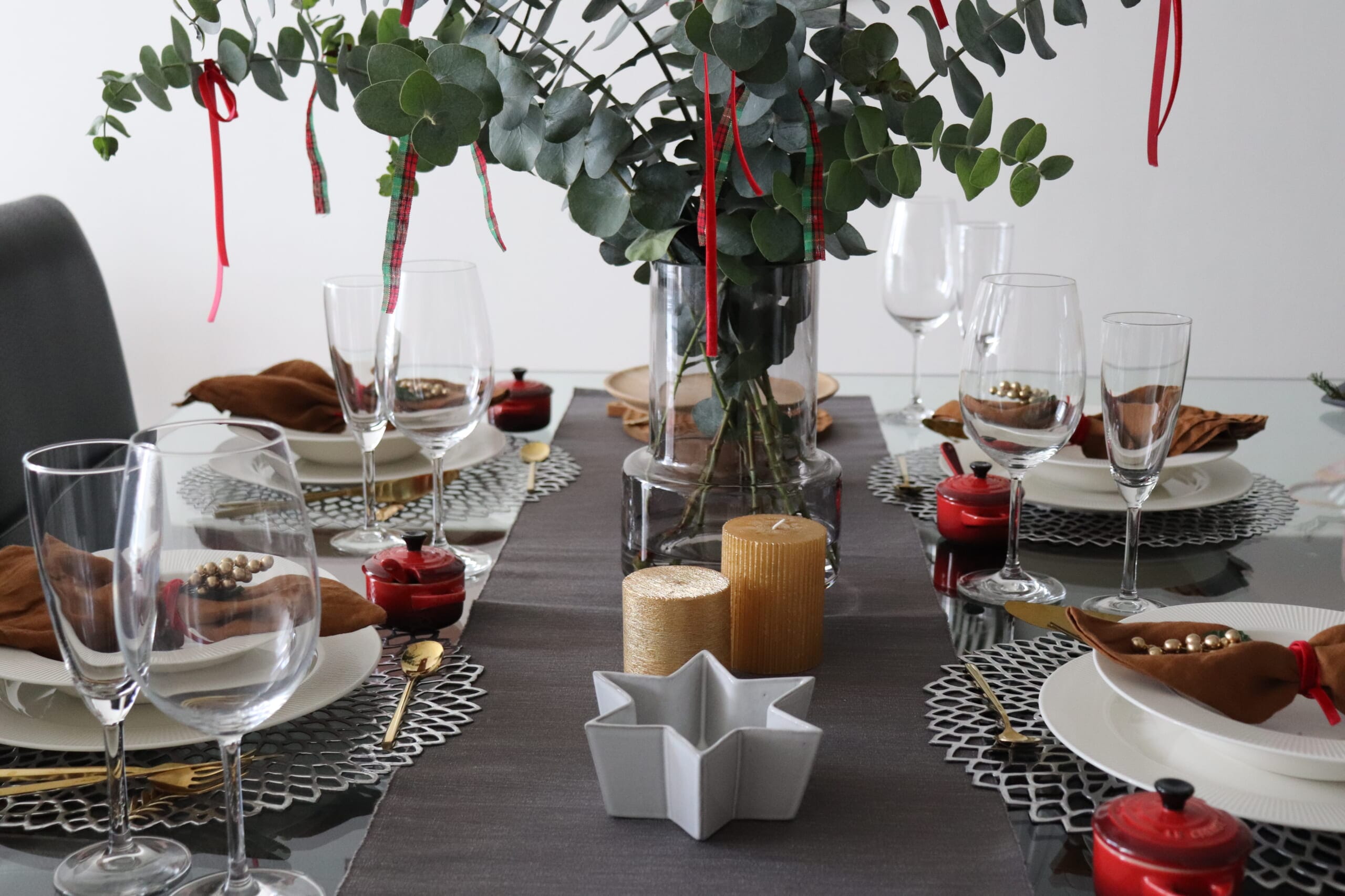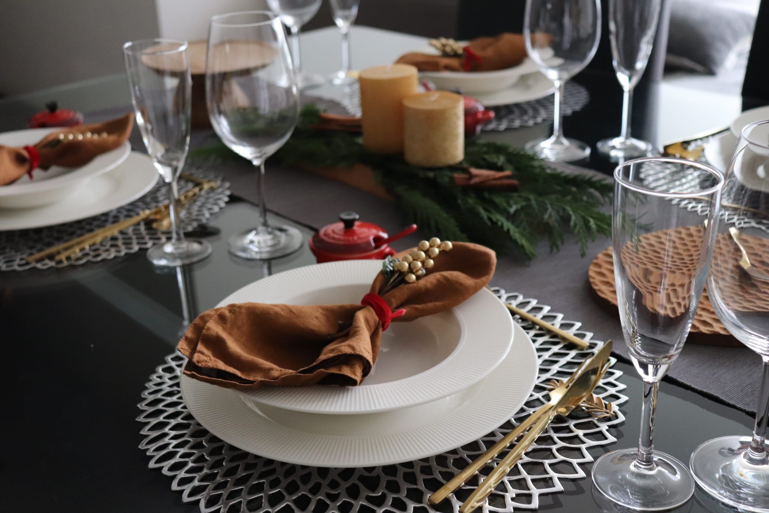 ツリーにも使ったリボンをナプキンにくるくると巻き付け、ルクルーゼのミニココットも追加して色に統一感を。