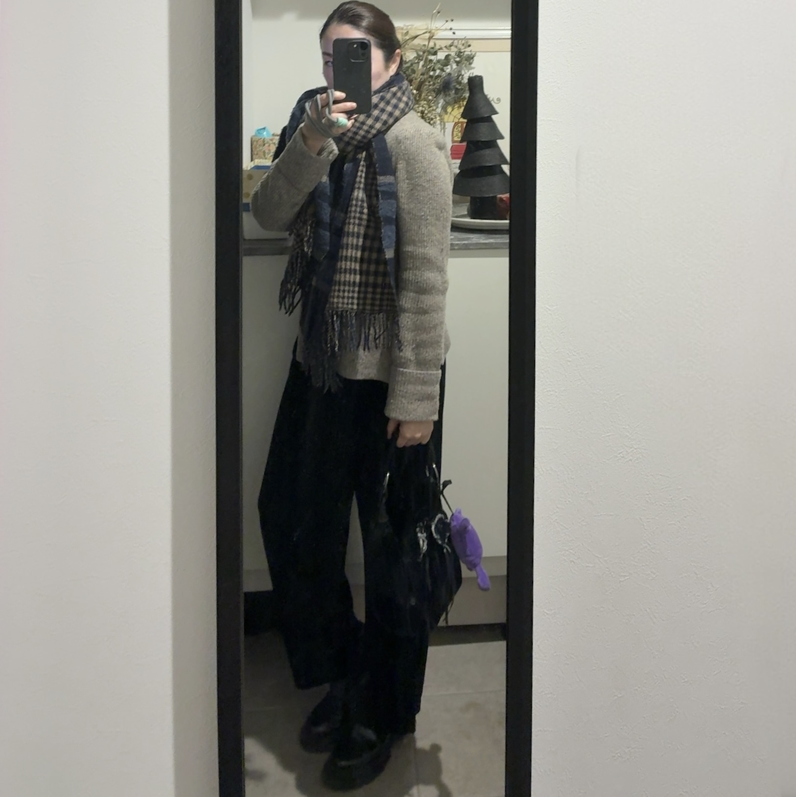 カラフルなネップ入りのグレーニットにネイビーのベロアパンツを合わせています。大判のストールにもネイビーが入っているのでまとまりのある印象。ちなみにバッグもネイビーです!
