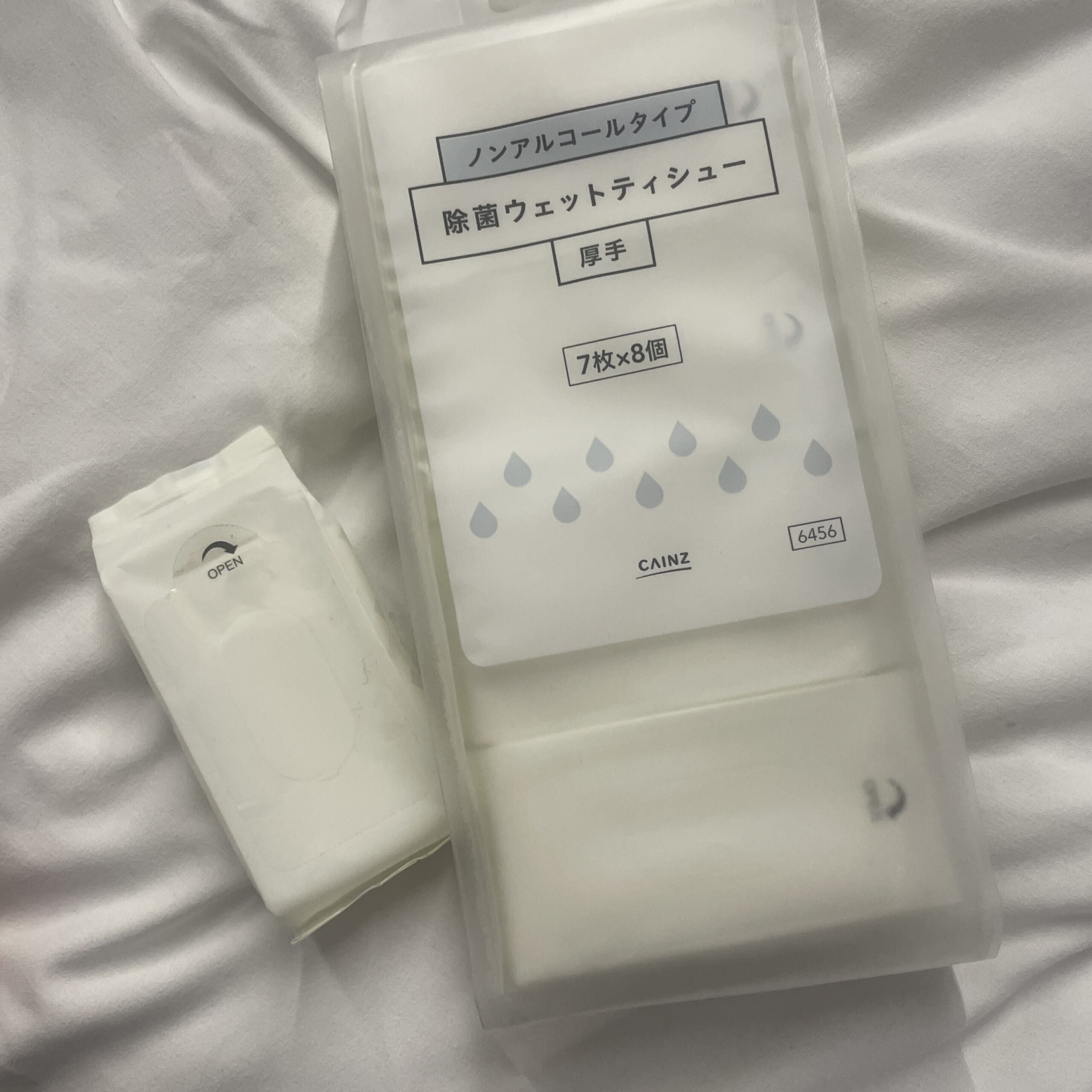 まずはカインズのウェットティシュ。7枚✕8個入り
