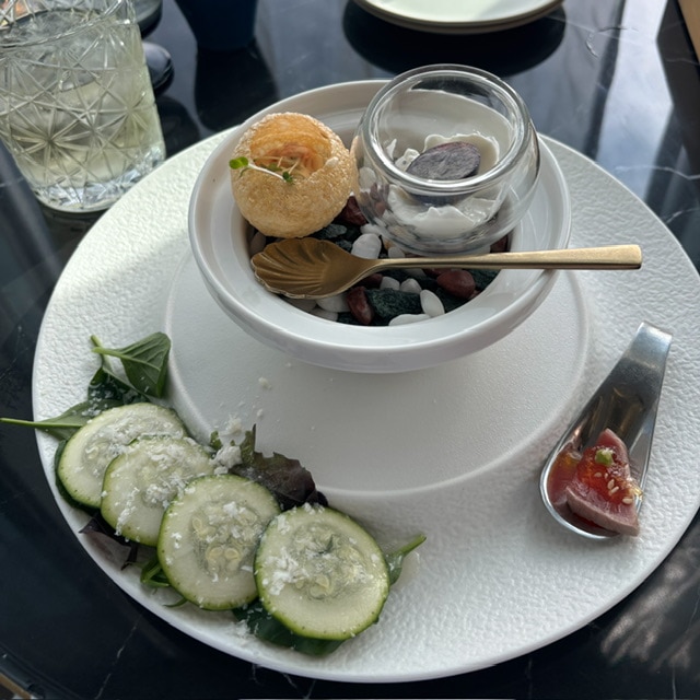 前菜3種盛りと濃厚うにクリーム麺のランチコースを注文しました◎