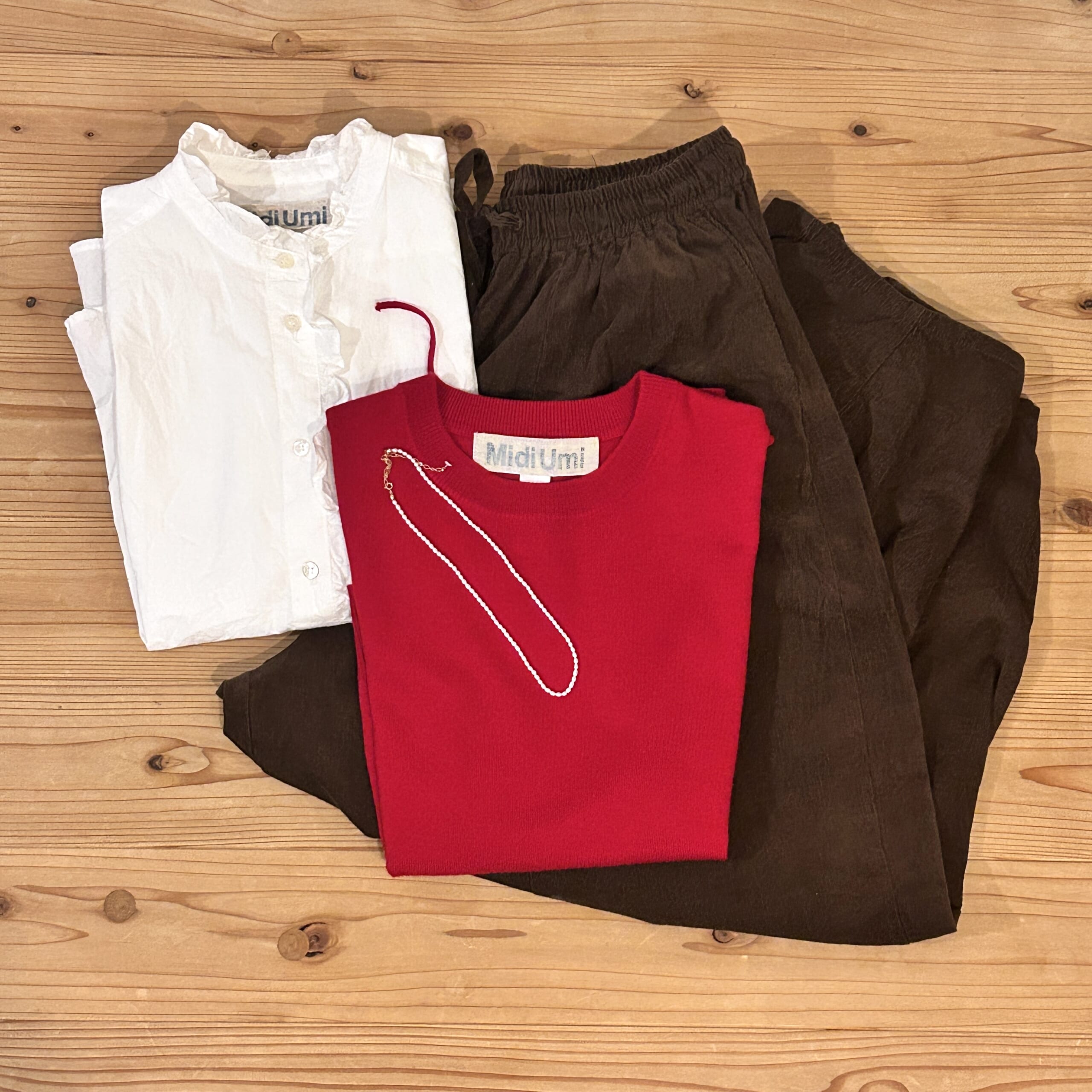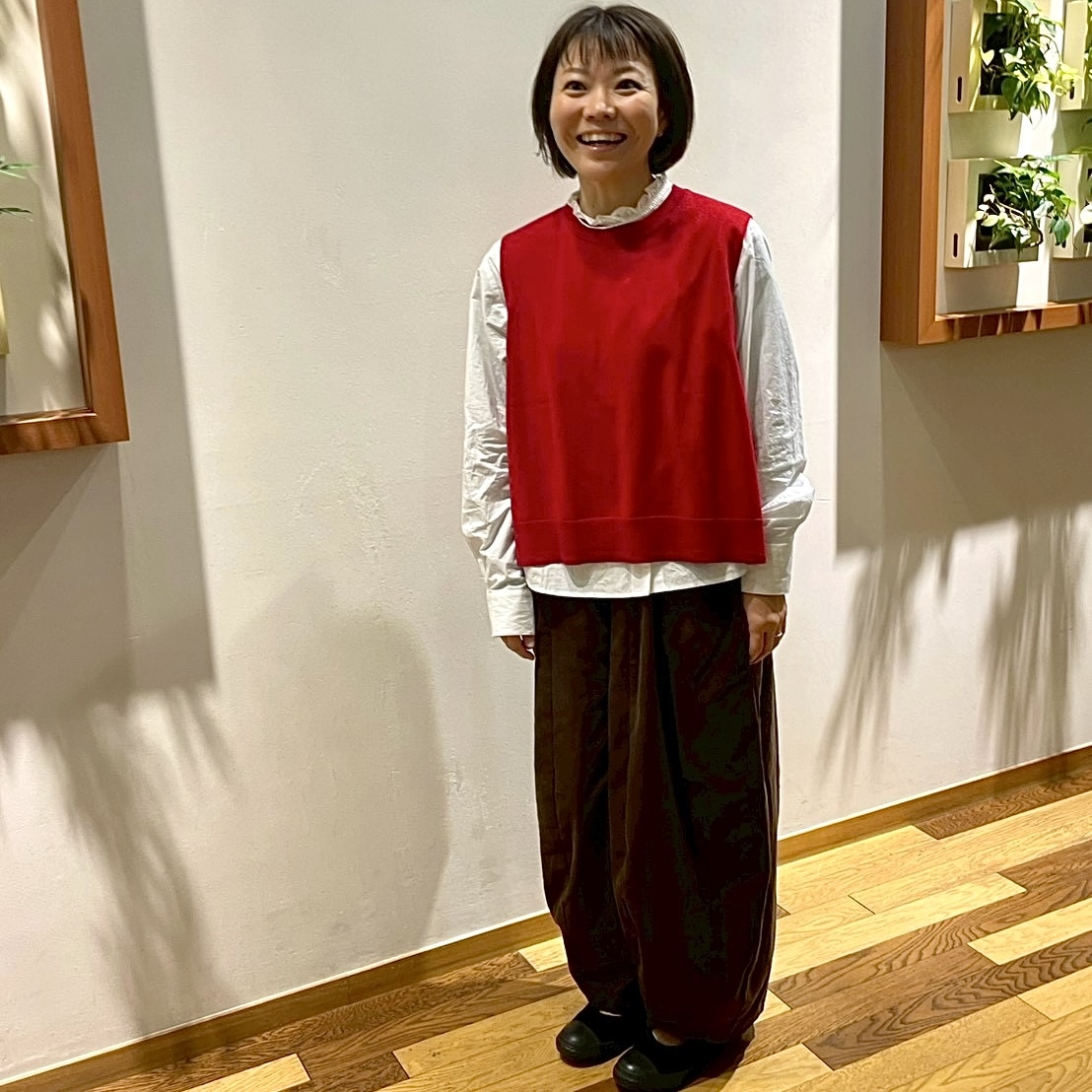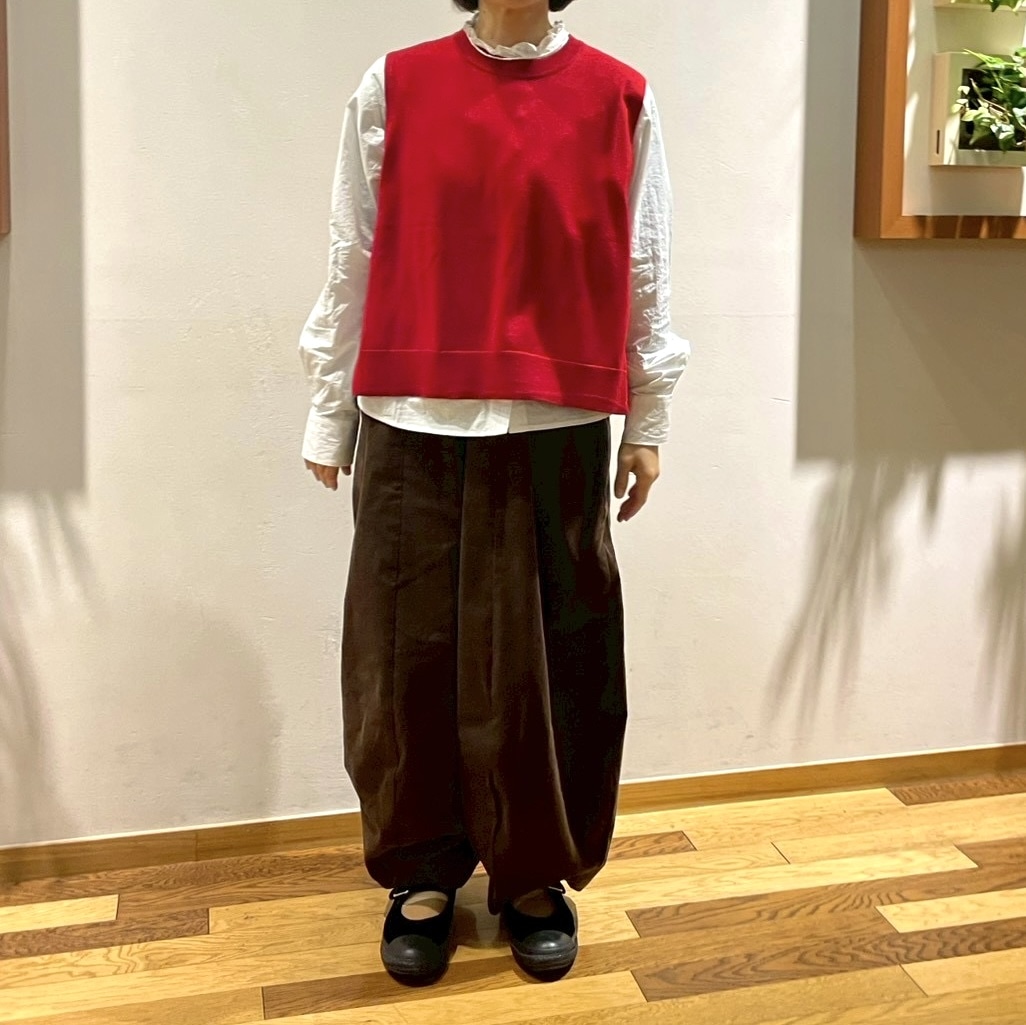 フリルシャツ、赤ベスト、茶色のコクーンパンツ全てMidiUmiです。
