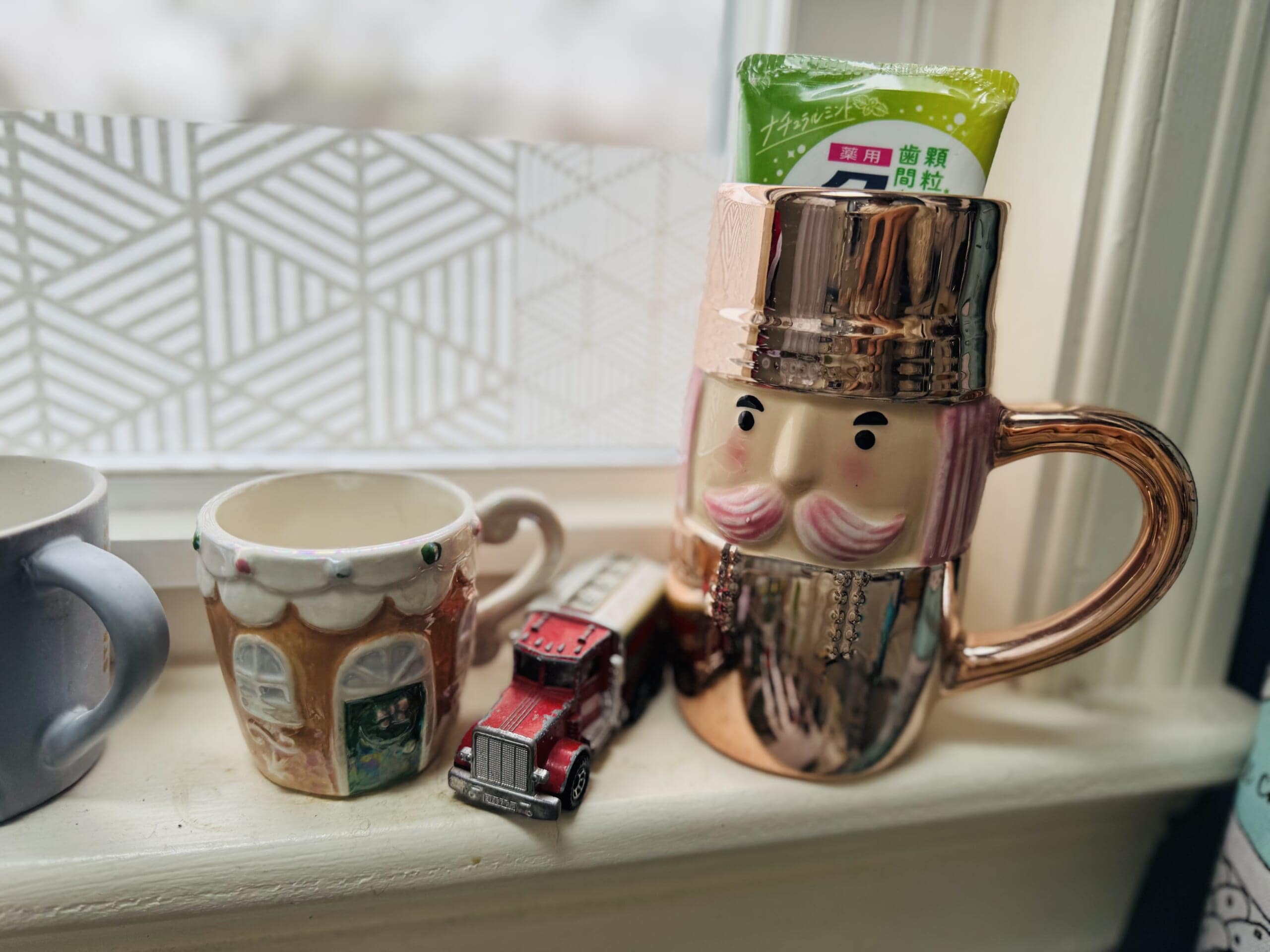 背の高い兵隊さんカップには普段歯磨き粉を立てて入れています。日本のドラッグストアで買う衛生用品は機能的お値段的に最高だけどパッケージデザインが好みじゃないことが多いので可愛いマグで目隠ししてます。