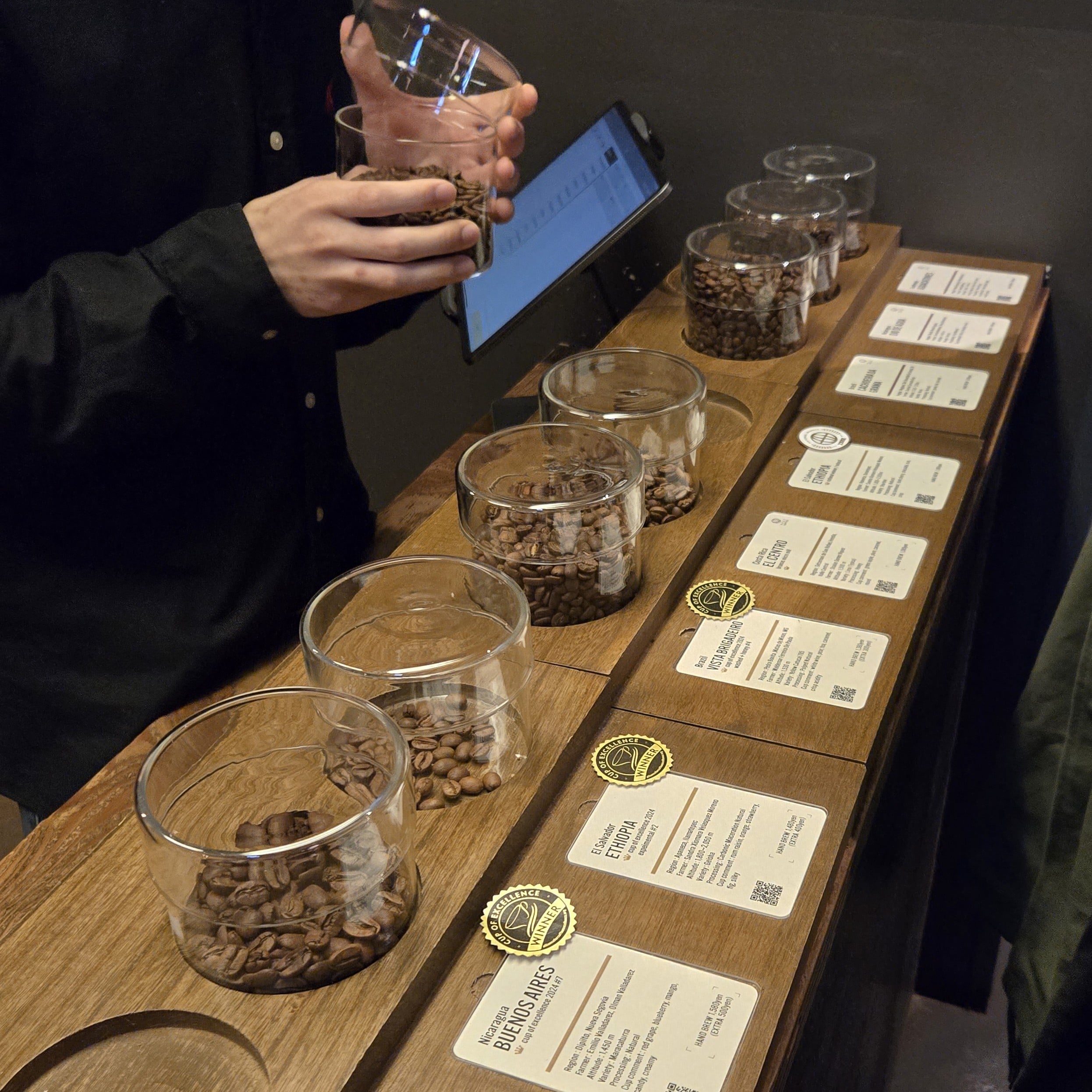 私の印象だと、こちらのカフェのメインは写真の「ビーンズカウンター」と呼ばれるカウンターで、バリスタさんとお話ししながら好きなコーヒー豆を選んで淹れてもらうというのがメインの楽しみ方かなと感じました✨常時8 ~ 9 種類の豆がおいてあるようです。実はブラックコーヒーが苦手な私は、隣でお話しだけ聞いて楽しみました。コーヒー豆の香りは大好き!笑 (ちなみに友達が頼んだ2種類のブラックコーヒーの味見をしましたが、素人の私でも分かる味や風味の違いでした!)