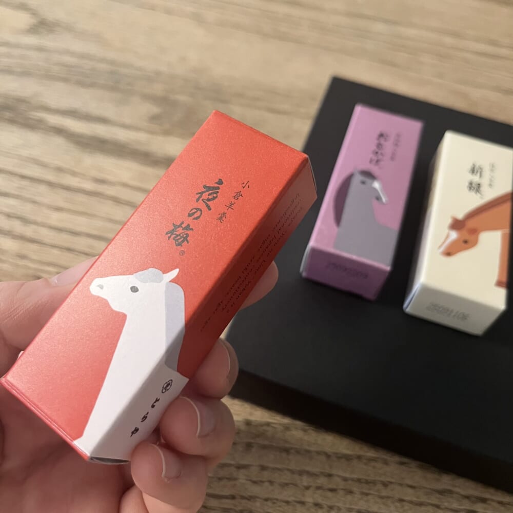 贈答品の定番としておなじみの小型羊羹のパッケージに、やさしいタッチでお馬さんが描かれています。かわいい~。