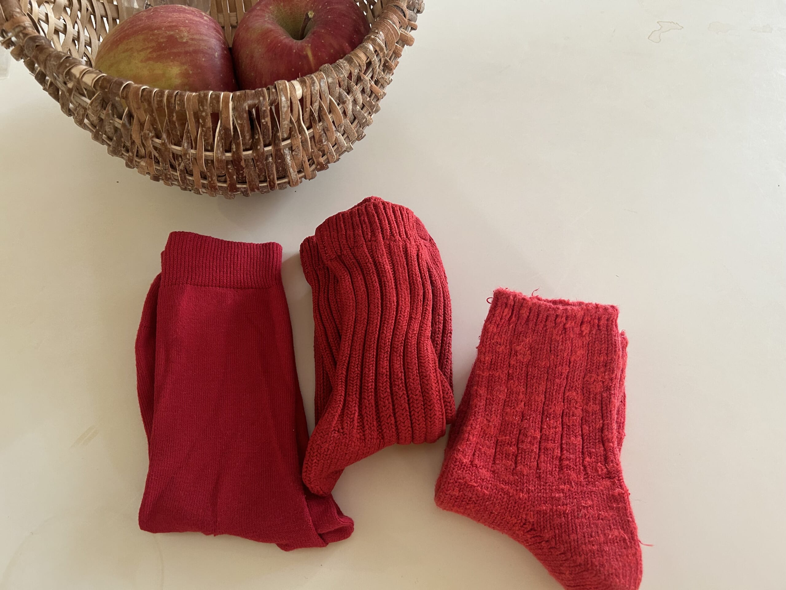 LEEでもたびたび取り上げられている「赤」。1点投入するとグッと雰囲気が出るような気がして、私も昔から大好きな色です。写真は少しずつ集めている赤ソックス。以前、卒業生のぐらちゃんからファルケのもの(一番左)を誕生日プレゼントにいただいてからよく履くようになりました。