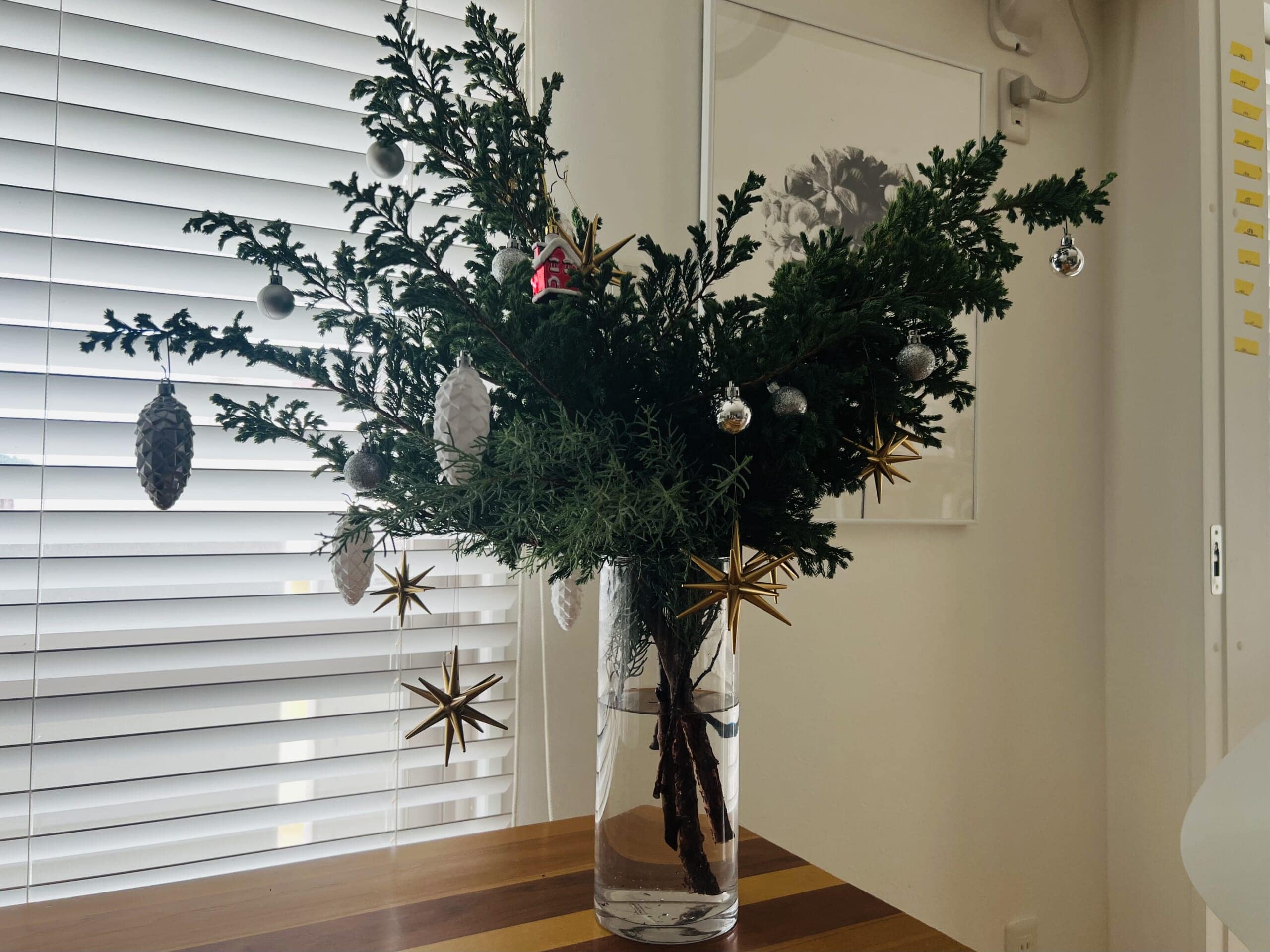 ずっと前に使い古したクリスマスツリーを処分してからというもの、何かともう今年のツリーはいいやと気合が入らず、“小さく飾る”クリスマスよりずっとずっと控えめな飾りで過ごしていました。今年こそ本格的に飾ろう!と意気込んでみたものの、いまだに買いたいものが見つけられなくて、気づけばもうすぐクリスマス本番。ということで、先日買って花瓶に生けたままだったブルーアイスとブルーバードを使って、ミニツリーらしきものを作って楽しんでみることにしました。