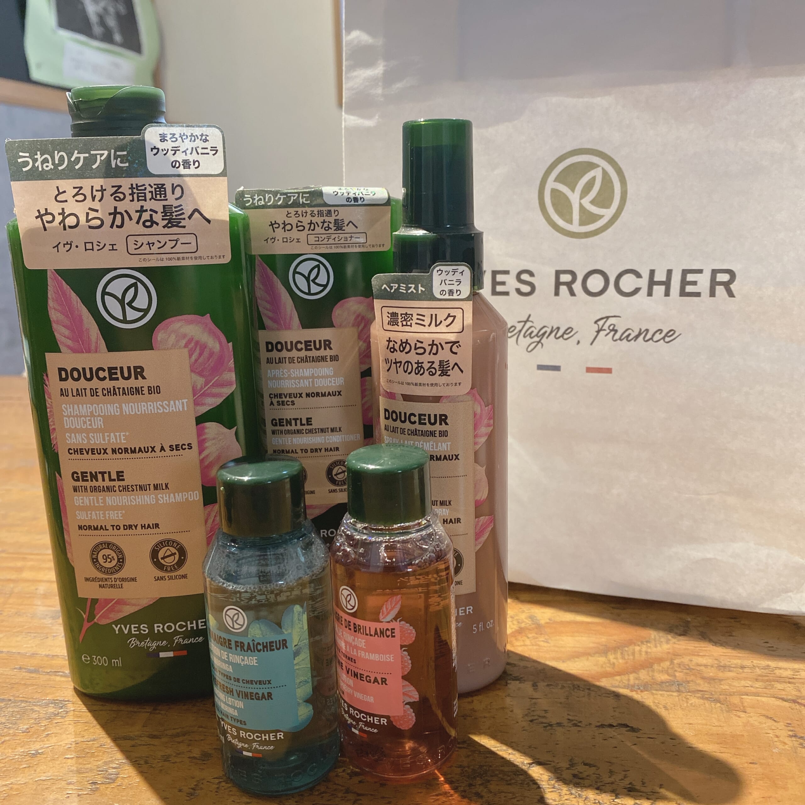 まずは、嬉しさ爆発のイブ・ロシェのシリーズ。シャンプー、リンス、ヘアミルクにビネガー。帰りの新幹線で中身を見て、早く試したくてウズウズ。今は毎日使わせてもらっているのですが、すごく香りが上品なんです♡髪もパサつきが抑えられて朝が楽ちんになりました!