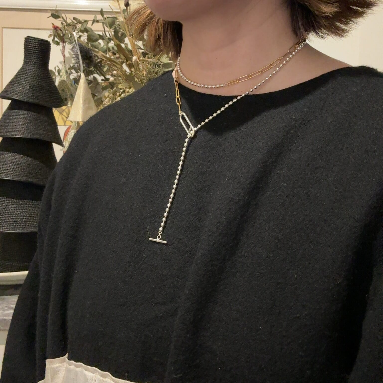この日はシンプルなブラックワンピースに付けました。ネック周りを少し華やかにしたくて、二連にしてY字のバランスに。この付け方がネックレスの存在が引き立つので一番気に入っています。