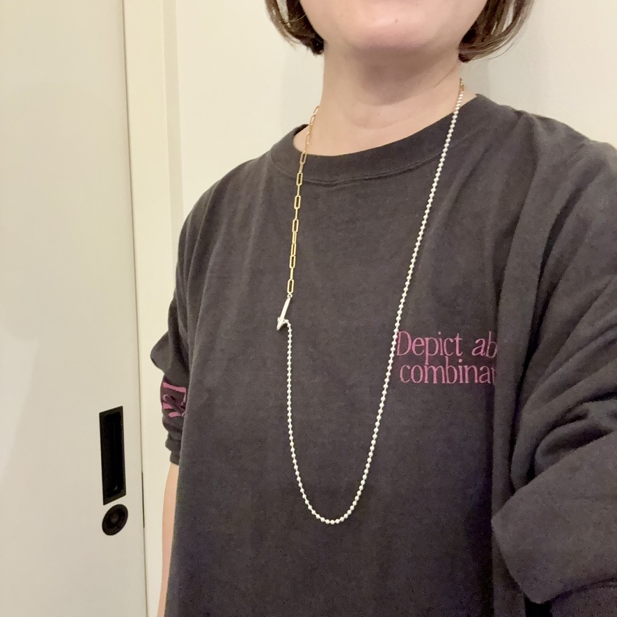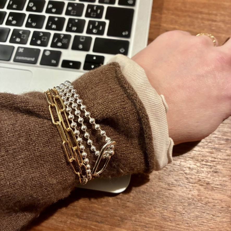 この日はロンTに合わせてカジュアルに付けたかったので、一連でシンプルに。シルバーとゴールド(シルバーにゴールドプレーティング)のMIXなので一連ながらも表情の違いがオシャレに映ります。