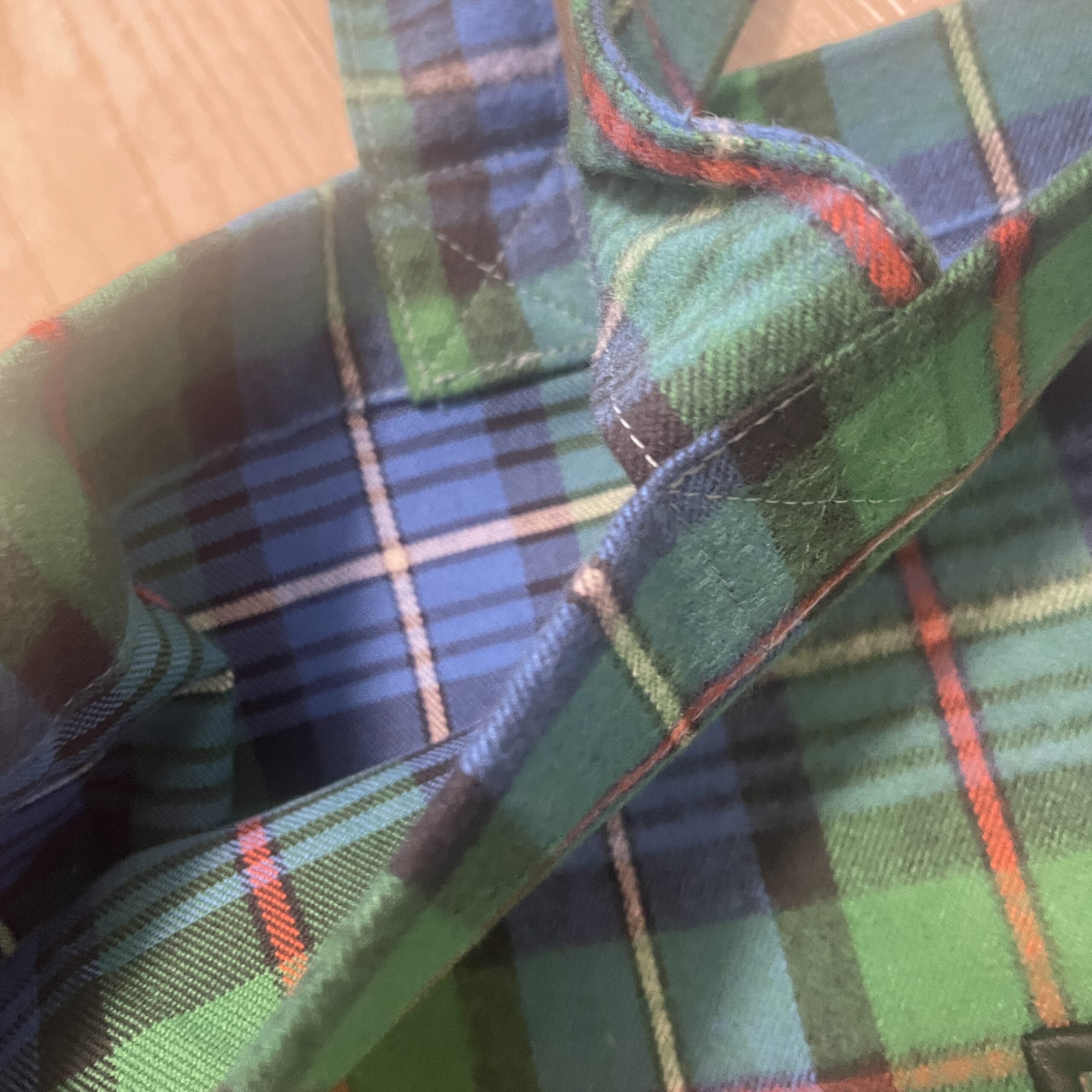生地は温かみのあるフランネル素材で手触りもGOOD。マッキントッシュフィロソフィーのチェックバッグよりも一回り大きく、形は正方形です。手持ち部分も長くて、コートの上から肩掛けも余裕でできます。