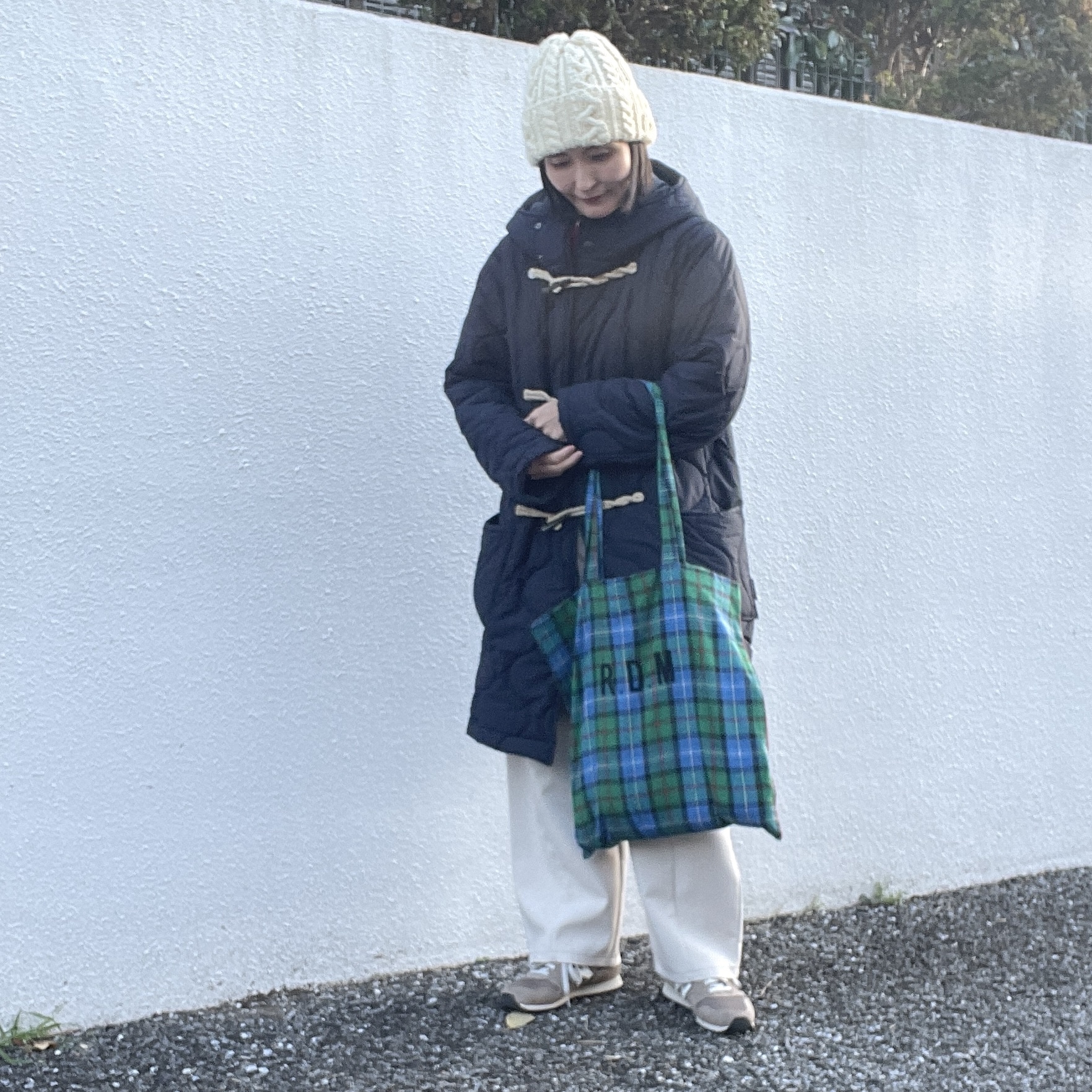 ネイビーのキルティングダッフルコートとニット帽に合わせてみました。