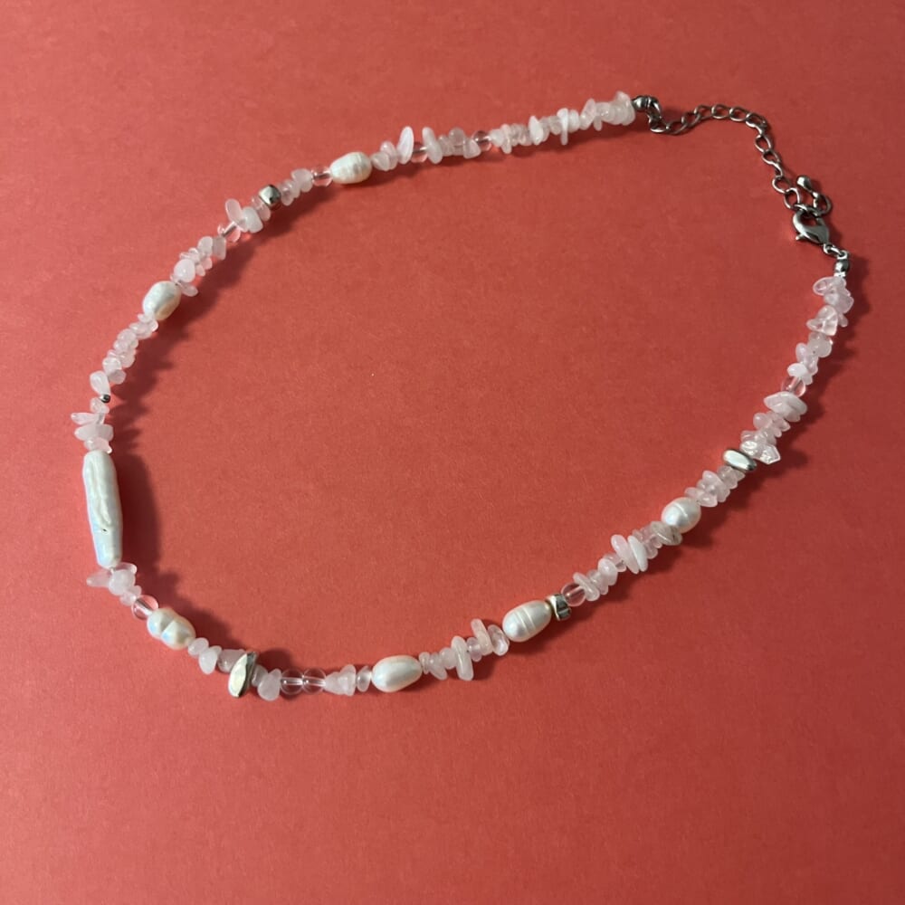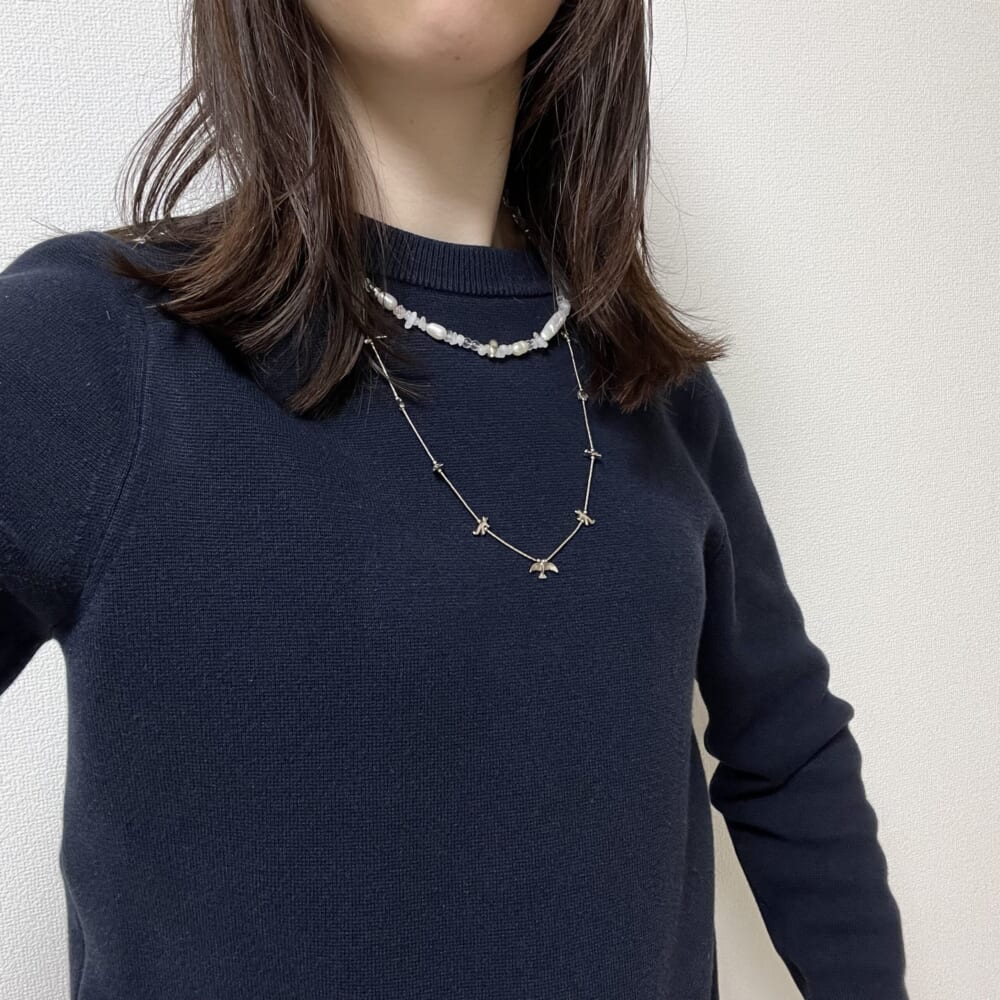 天然石のネックレスは、最初はLEE表紙を参考に大ぶり&カラフルなもので探していて、試着もしてみたのですが、なんだかわたしには似合わず、どうもちぐはぐな印象に…。