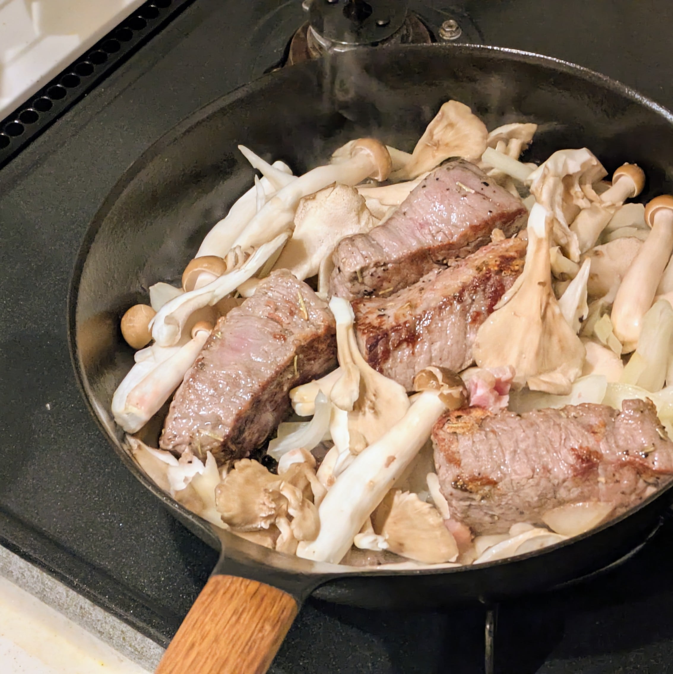 - フライパンで表面をしっかり焼き固めて、旨味を閉じ込めます。一旦取り出してから、同じフライパンで玉ねぎ、きのこ、ベーコンを入れて炒める。