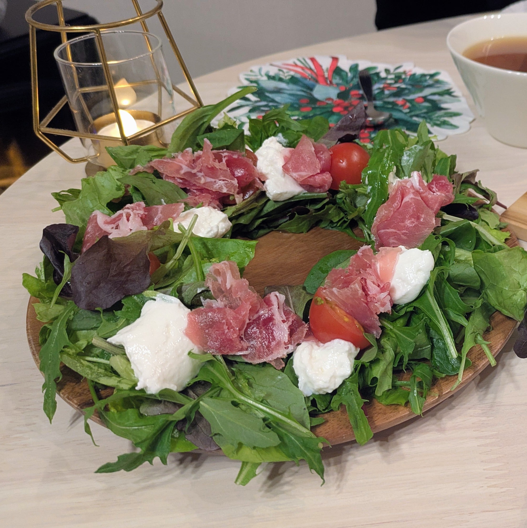 これは毎年の定番です!ベビーリーフをドーナツ状に盛り付けて、生ハムやミニトマト、水切りヨーグルトを飾り付ければ、一気にテーブルが華やかに。