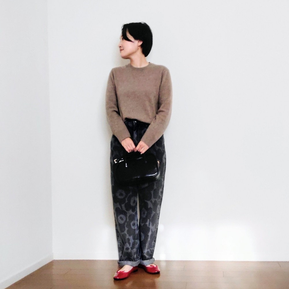 まずはシンプルにユニクロのカシミヤクルーネックセーター(メンズのSサイズ)と。足元に赤のバレエシューズ。シンプルな中に色を入れたい。
