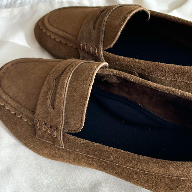 光沢のあるレザーも素敵だけれど、ローファー初心者はスニーカーの延長線上で履けるスエードがいいかも?という直感です。