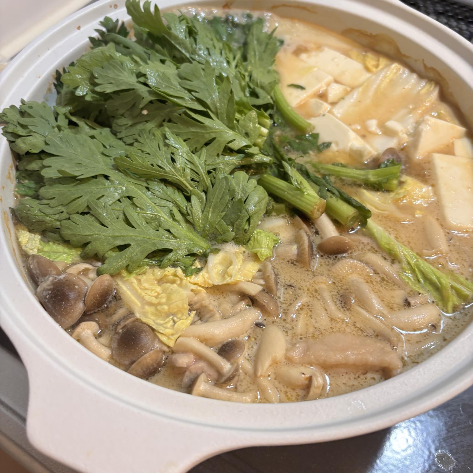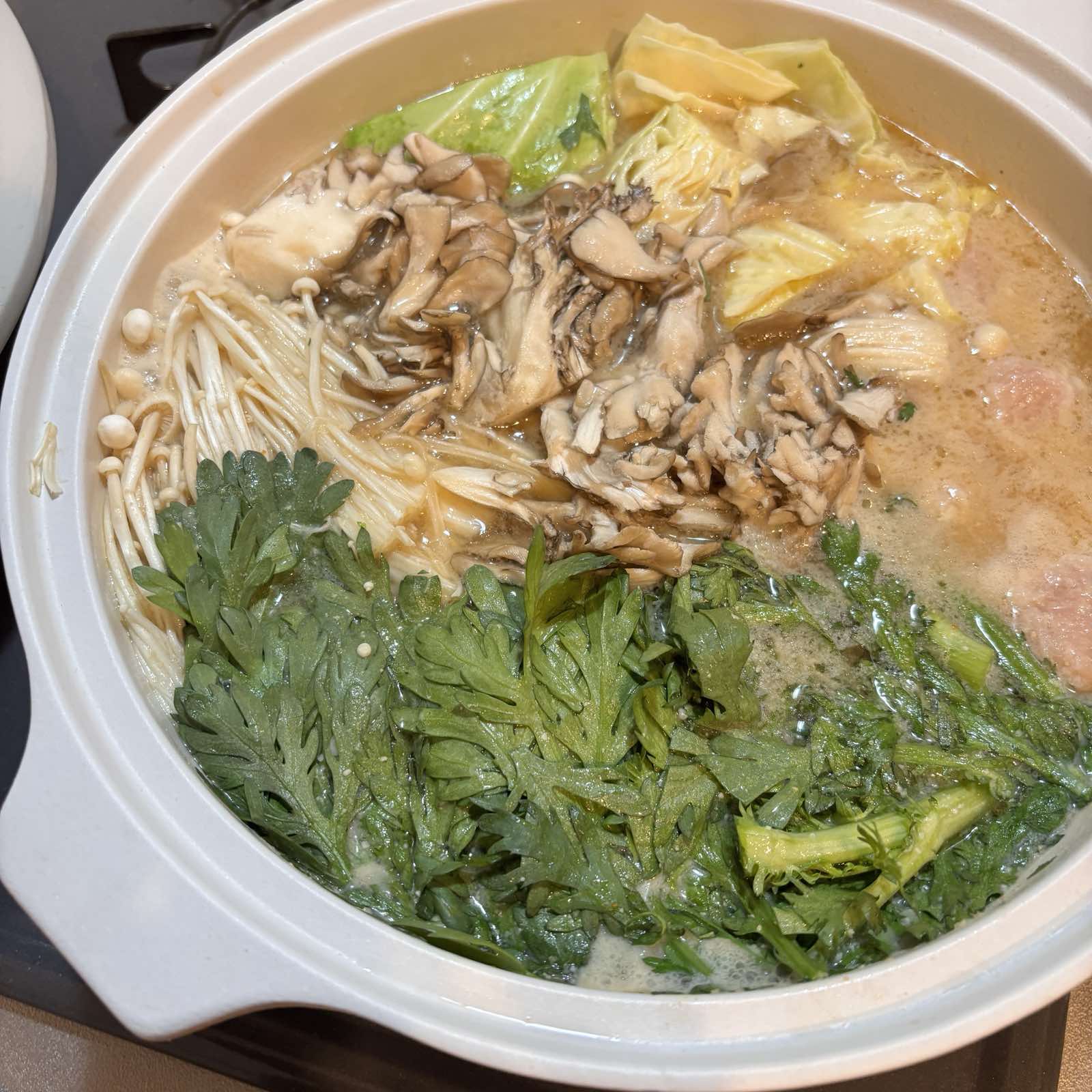 ーと思うんです。味噌鍋ってやや濃いめな出汁のイメージがするのです。これは、味噌のコクと少し甘めの出汁と鶏のエキスと、いろいろと。