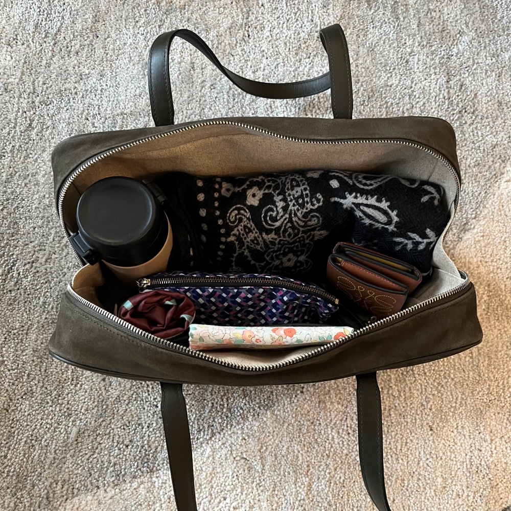 持ち手が長いので肩にかけられ、しっかりマチがあって容量も十分!これだけ入れてもまだ余裕ありです!