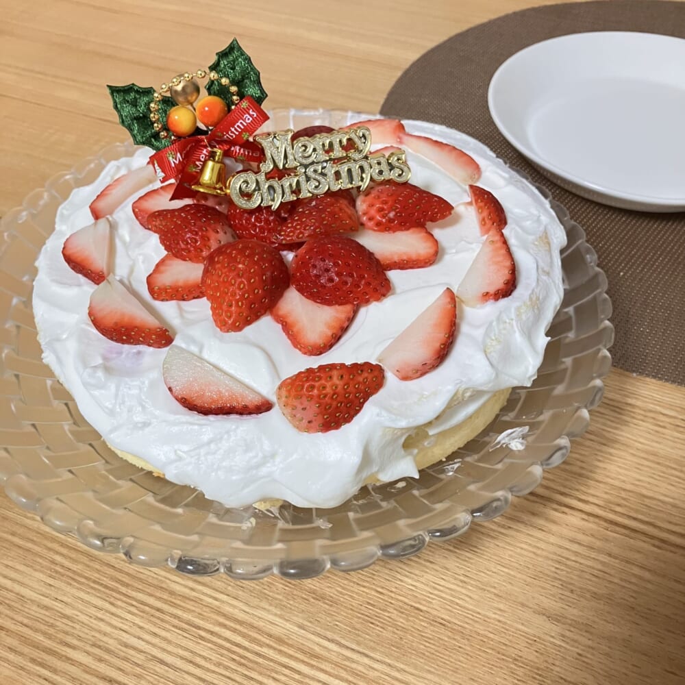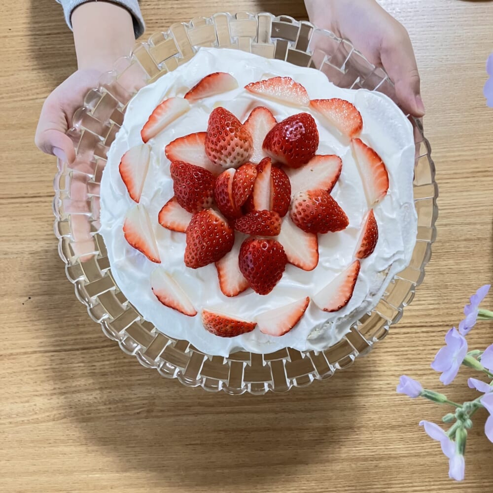 飾りをつけて完成です。このレシピ、側面には生クリームは塗らないので、おおざっぱな我が家にぴったり!おおらかな気持ちで楽しく作れました!