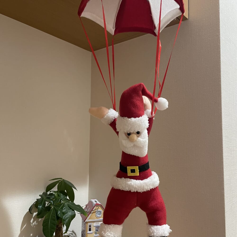 玄関には、昨年子供たちと行ったフライングタイガーで買った、パラシュートサンタさんを飾っています。