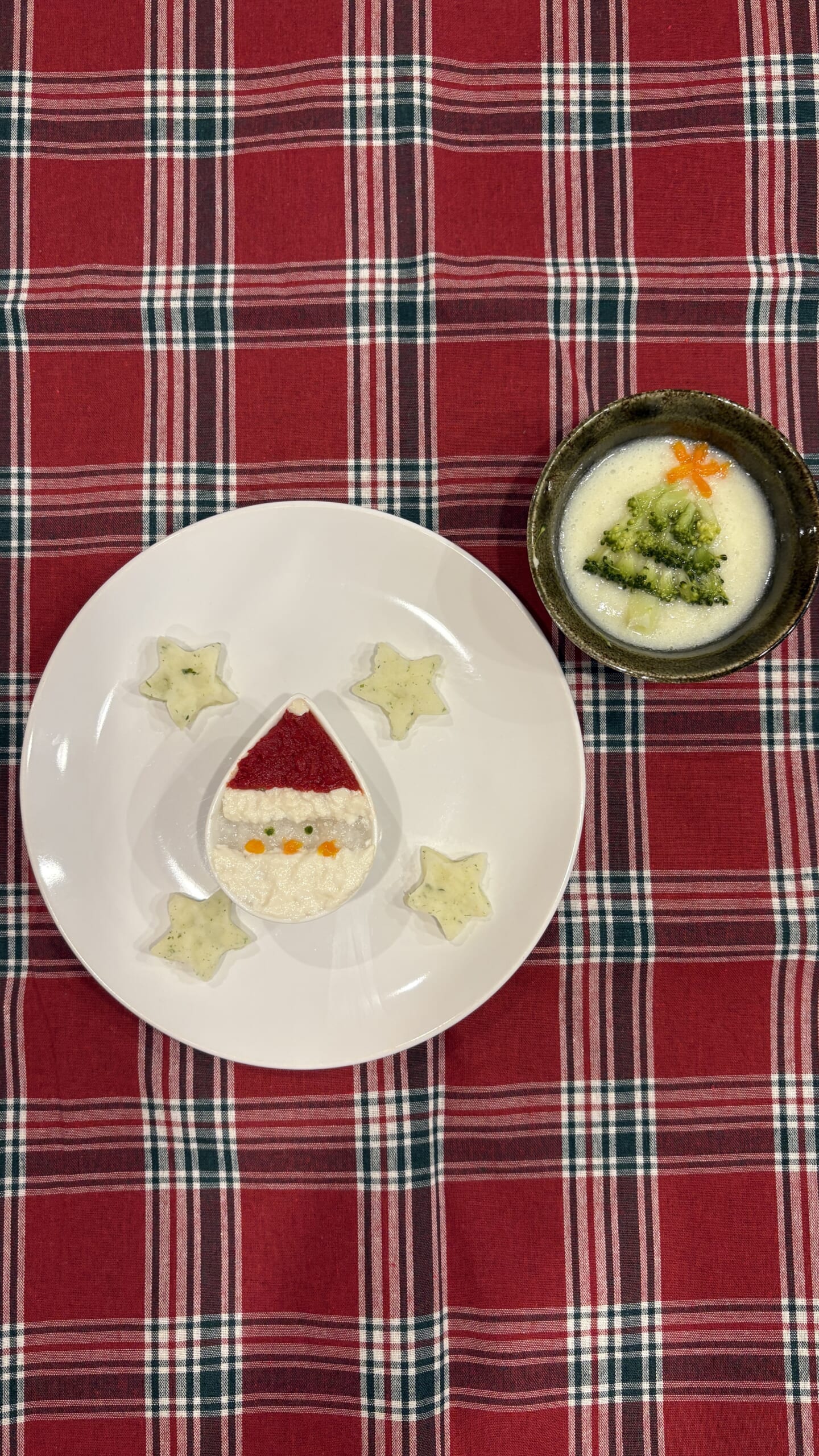 サンタのお粥(帽子はトマトペースト🍅、髭は豆腐、目はほうれん草🥬、ほっぺと鼻はにんじん🥕)と冬野菜のポタージュ(ツリーはブロッコリー、星はにんじん)にしました。ちなみに、ポタージュは味付けする前のものです!