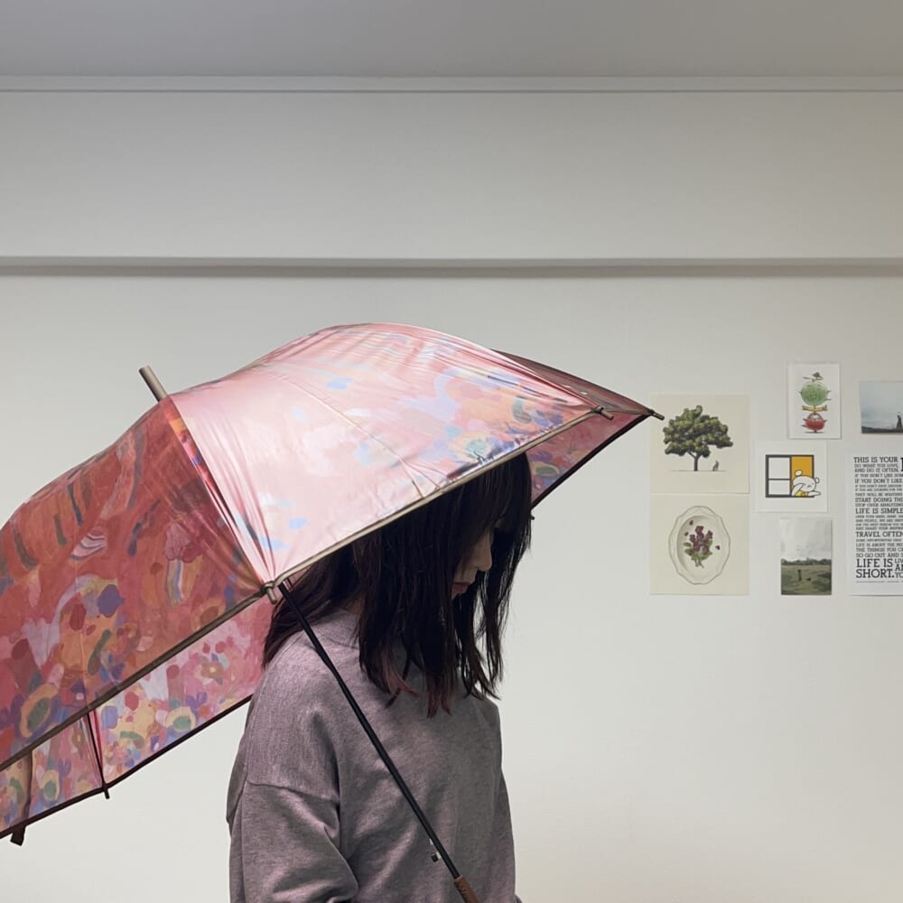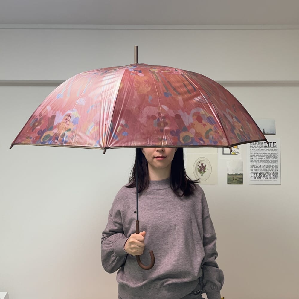 ビニール傘にプリントされているのはヘラルボニーの契約作家である三谷由芙さんの「りんごのブーケ」というアート。