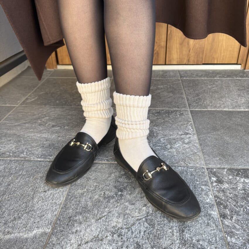 着用しているユニクロのルーズソックスは「くしゅっとさせて履ける、厚めのニットのソックス」といった感じで、大人も違和感なくコーデに取り入れられます。
