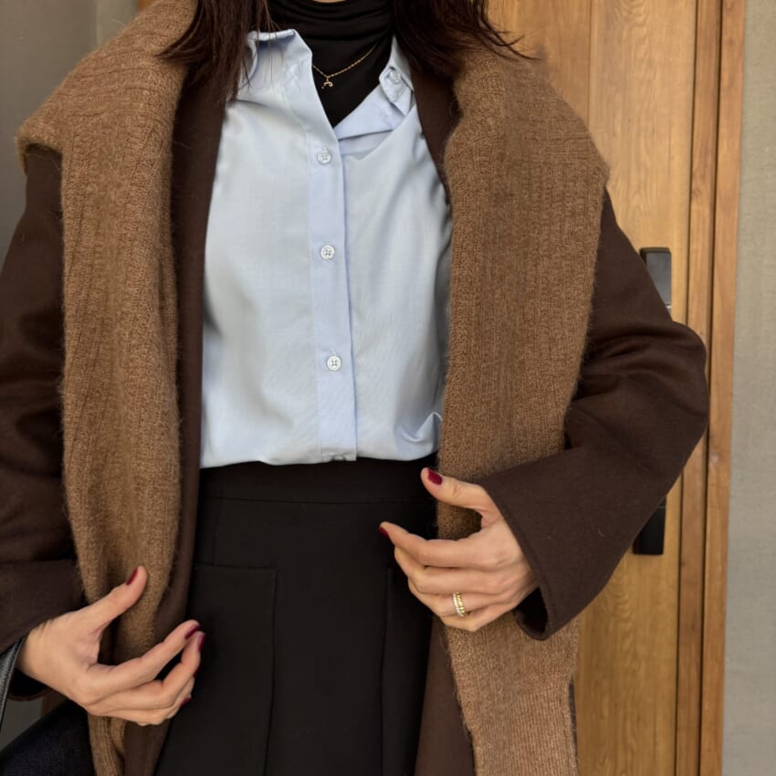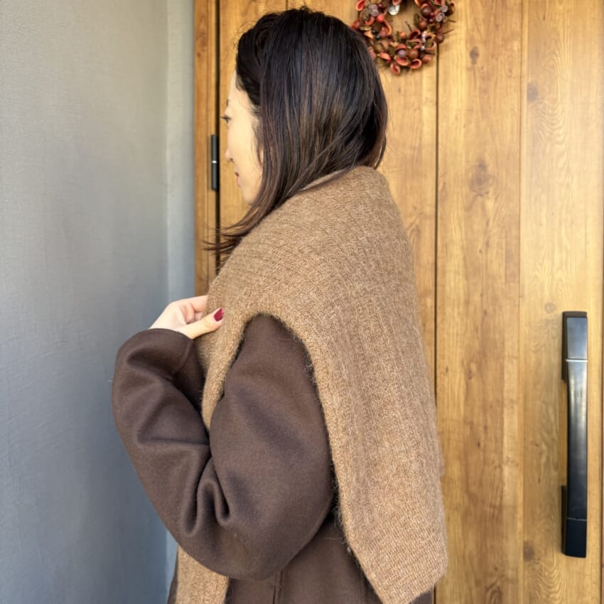淡いブラウンのストールやマフラーも持っているのですが、今回はあえて「ニット」を肩にかけてみました。