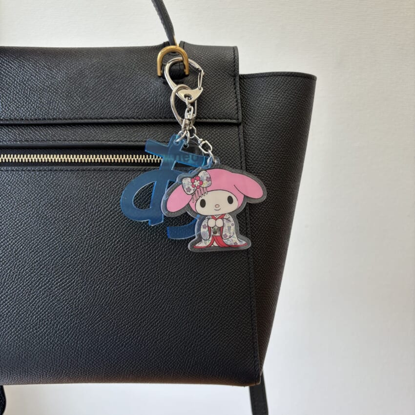 バッグの構造上、正面に付けられないので、裏側にさりげなくチャームを。この時は「江戸☆大奥」展で購入したマイメロちゃんと、「デザインあ展 neo」のキーホルダーをつけて行きました。