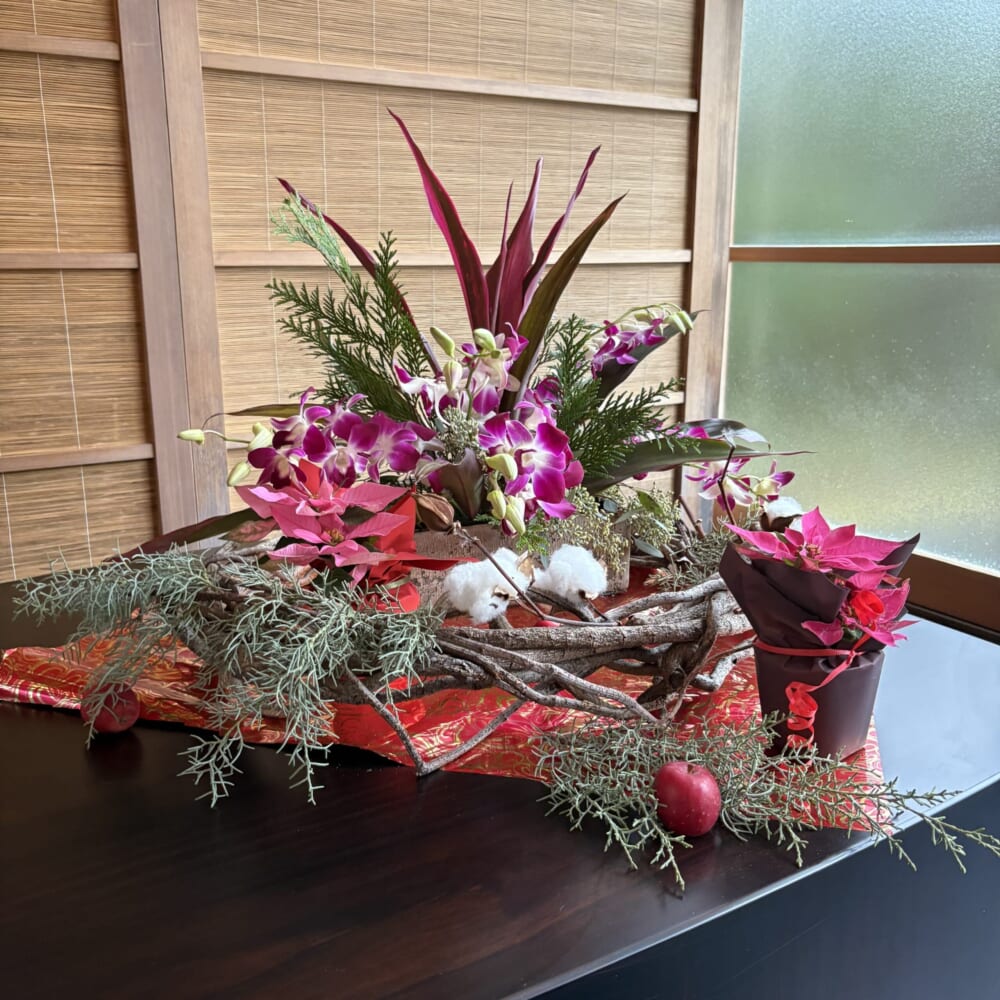 優しい色のポインセチアが、和の空間に違和感なく馴染んでいます。