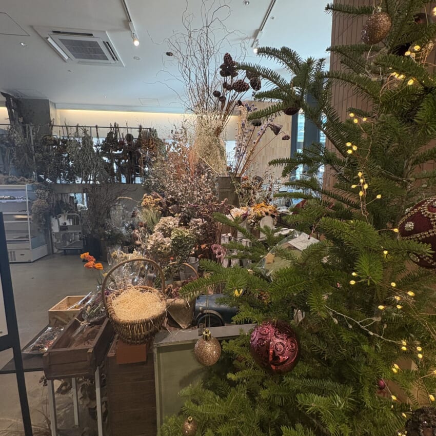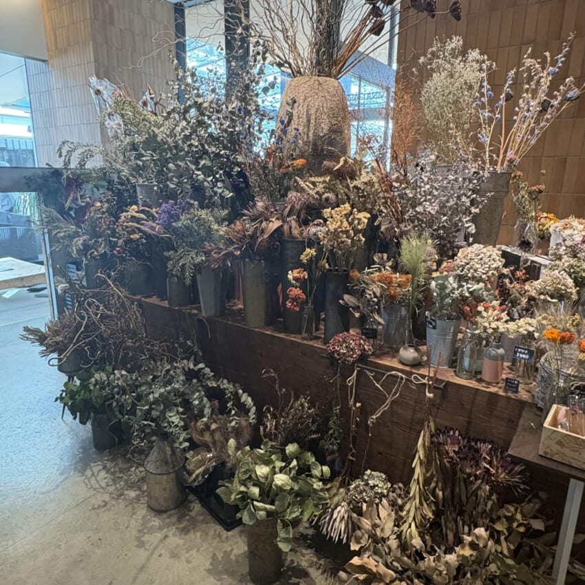 季節のお花が溢れんばかりに並んだ入口を抜けると、店内にもドライフラワーがいたるところに飾られていて、カウンターにはキラキラしたかわいらしいパンがずらり…!