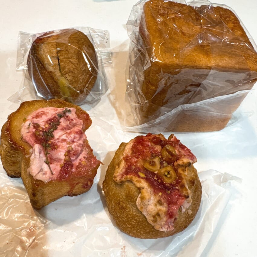 左はピスタチオクリームが挟まれたパン、右上はお馴染みの「ムー」、下2つの商品名は失念してしまいましたが(すみません)、いちごジャムがメインのパンたち。どのパンももちろんおいしかったのですが、やはりふわっと柔らかく、噛むとじゅわっとバターの味が広がるムーのおいしさは唯一無二でした…!