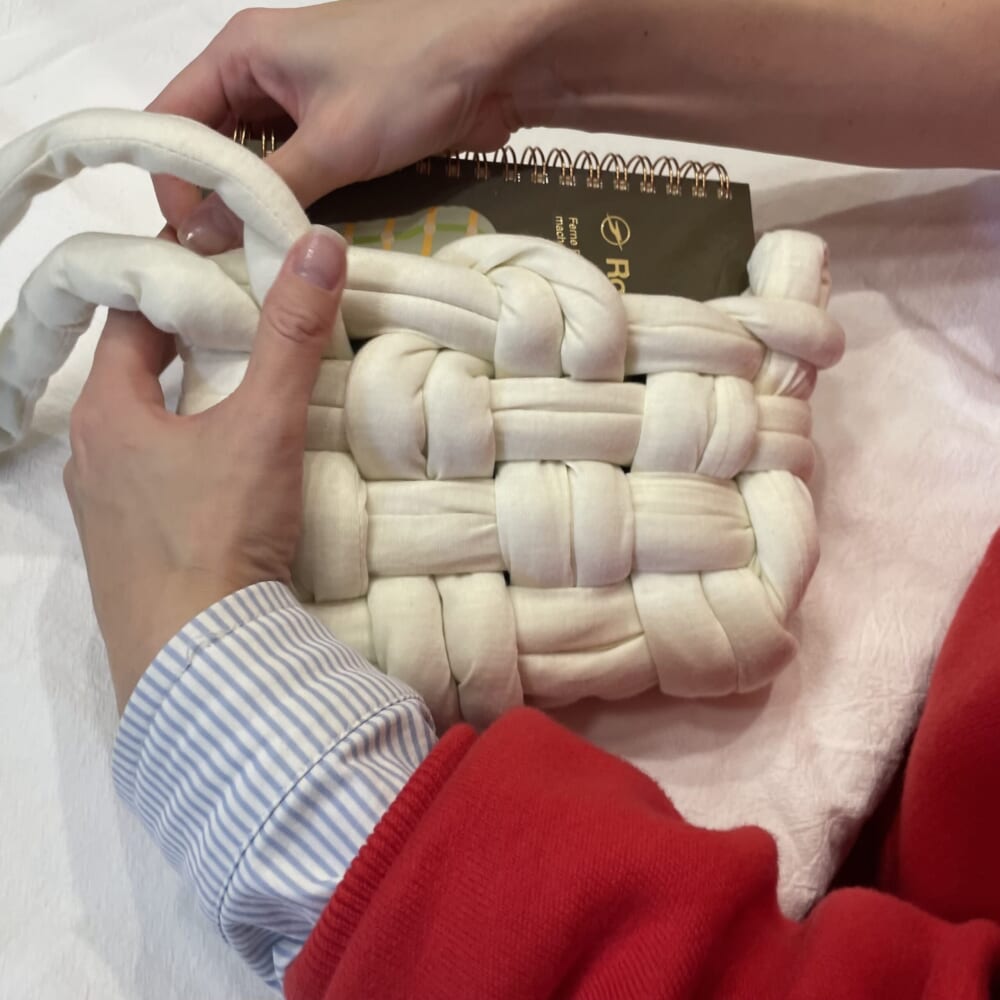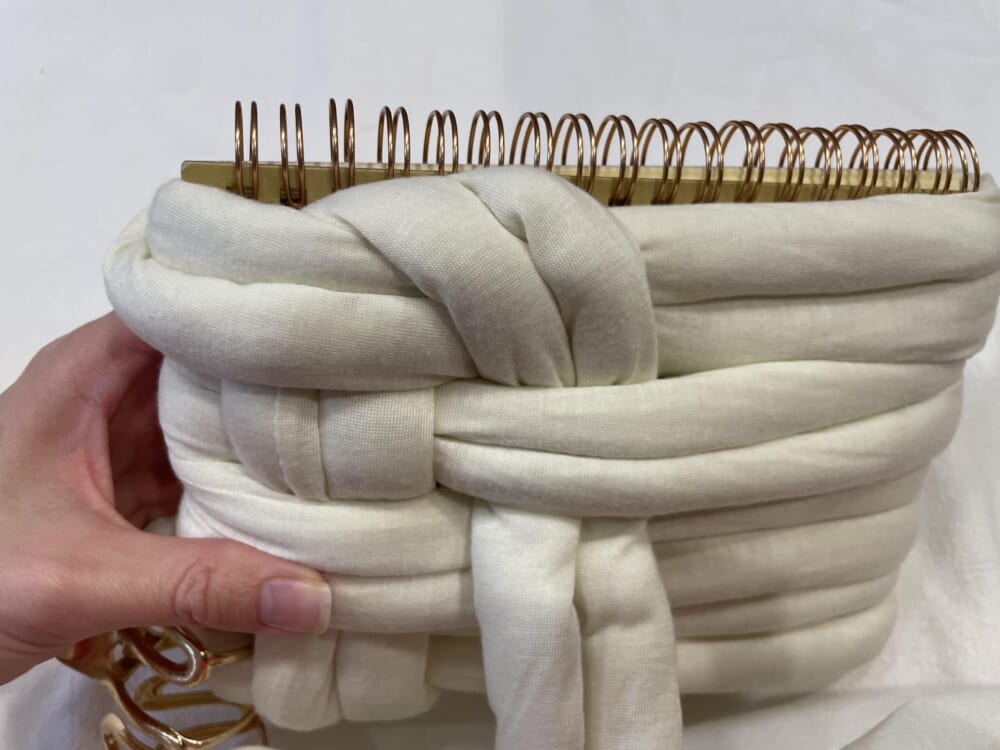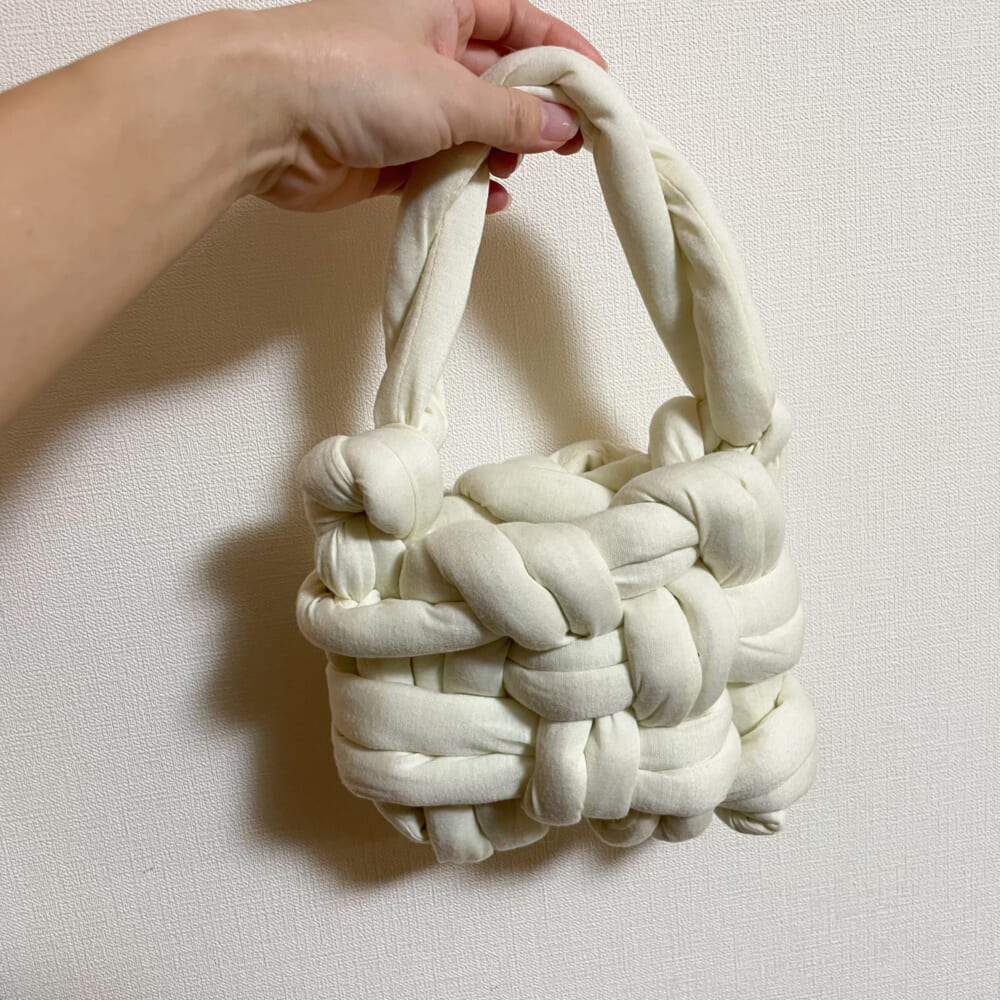 2本一緒に、作っておいた持ち手の輪に通し、結びます。余った部分はバック部分へ編み込み、完成です。