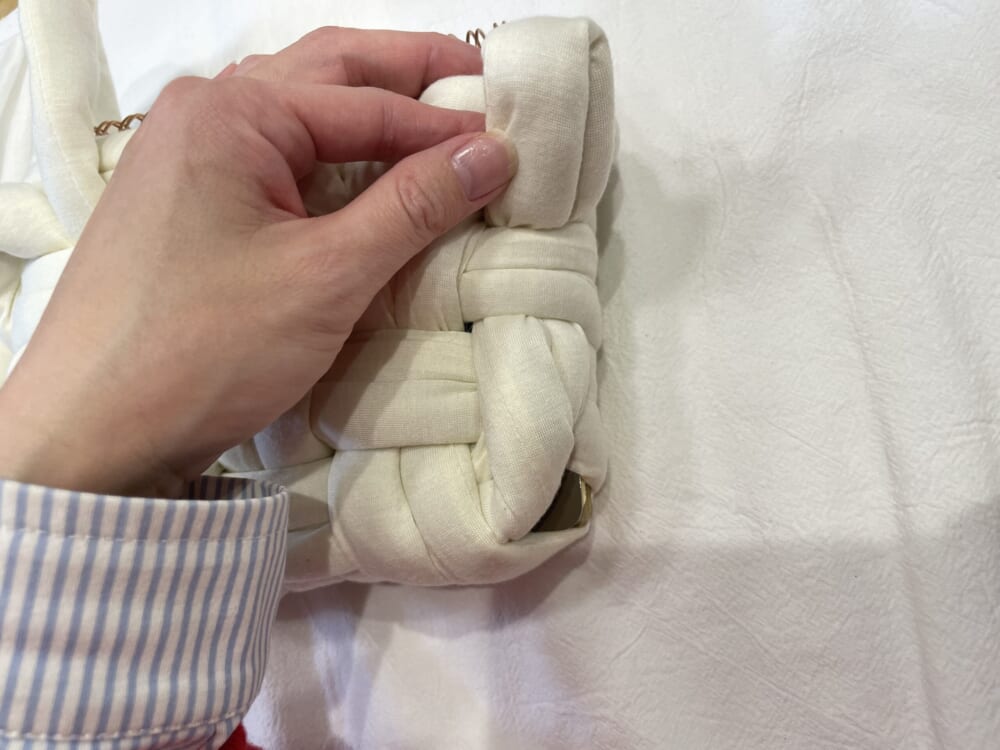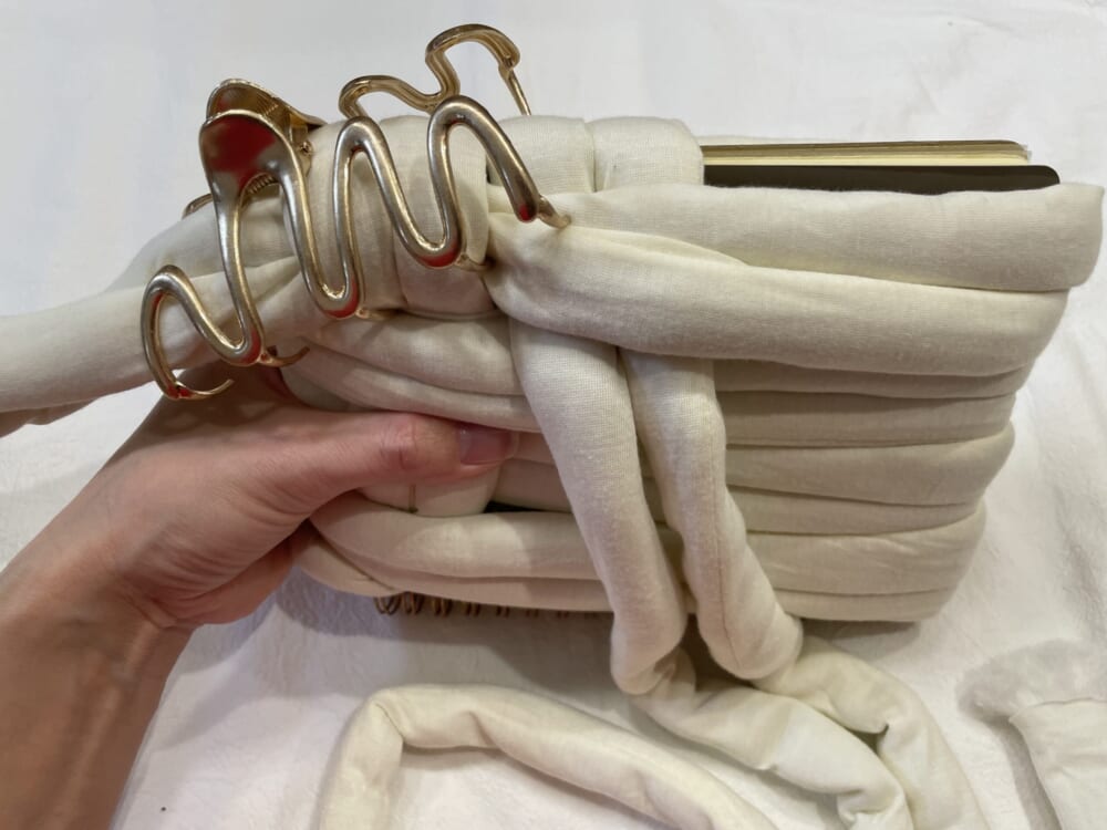 バックの口にしたい方は、上を開け、横に織り込んでいきます。