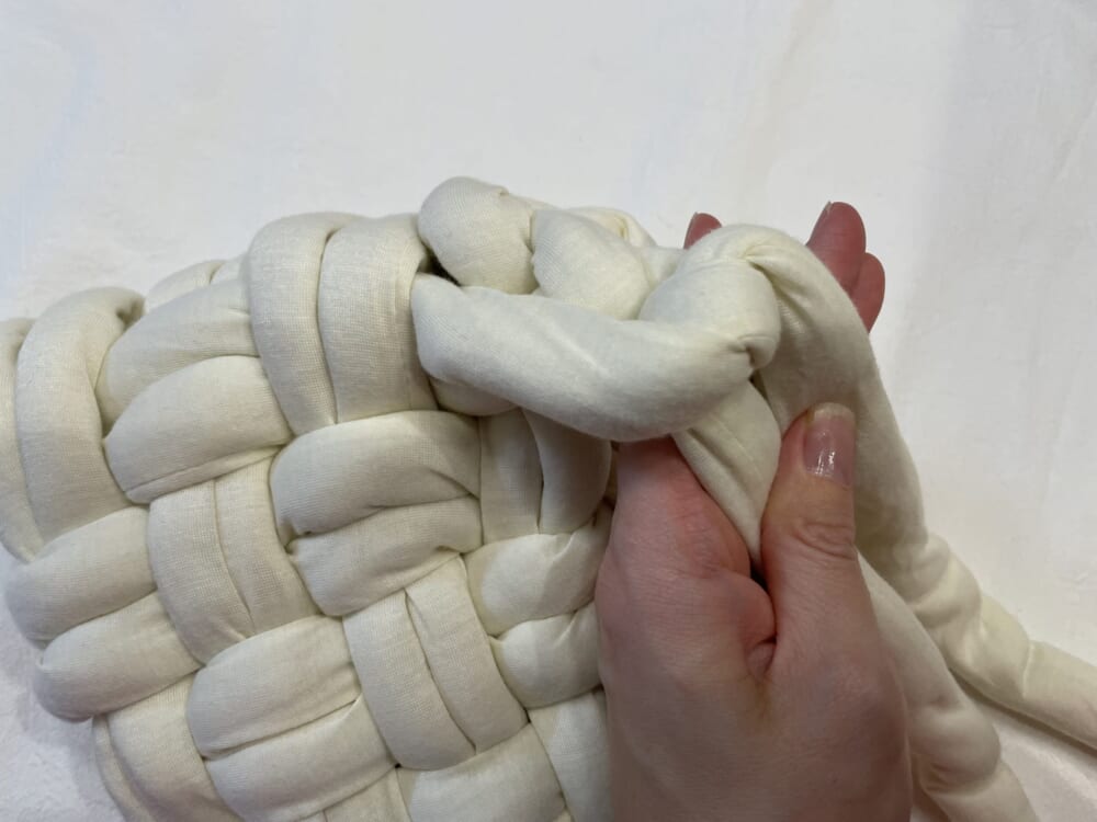④一番初めに余らせおいた輪を上まで編み込み、持ち手のためのループにします。