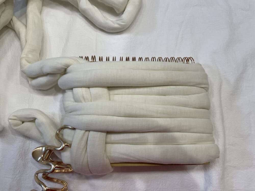 ②輪にした部分を【ノートの横幅+3~4センチ程度】上に余らせます(私はこれをノートの幅ピッタリにしてしまい、後に後悔しました!)、余らせた部分は、持ち手を留める部分になります。