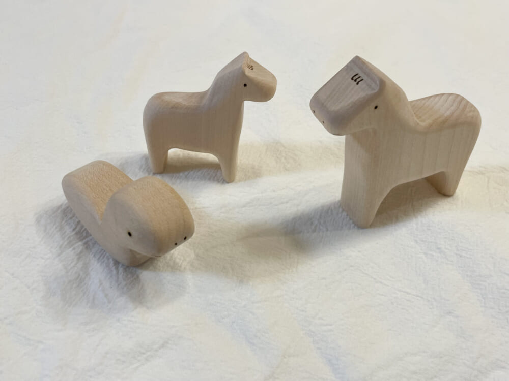 去年蛇さんをいただきまして、今回馬の親子をいただきました。木製で丁寧につくられているのがうかがえます。手触りもつるすべ。