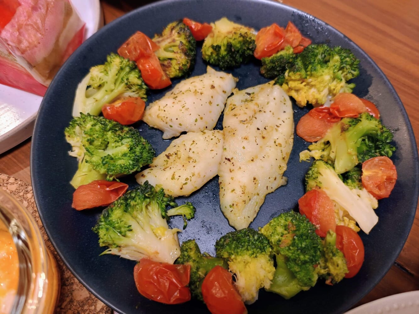 白身魚とブロッコリー、ミニトマトを一緒にただただ焼いただけのもの。