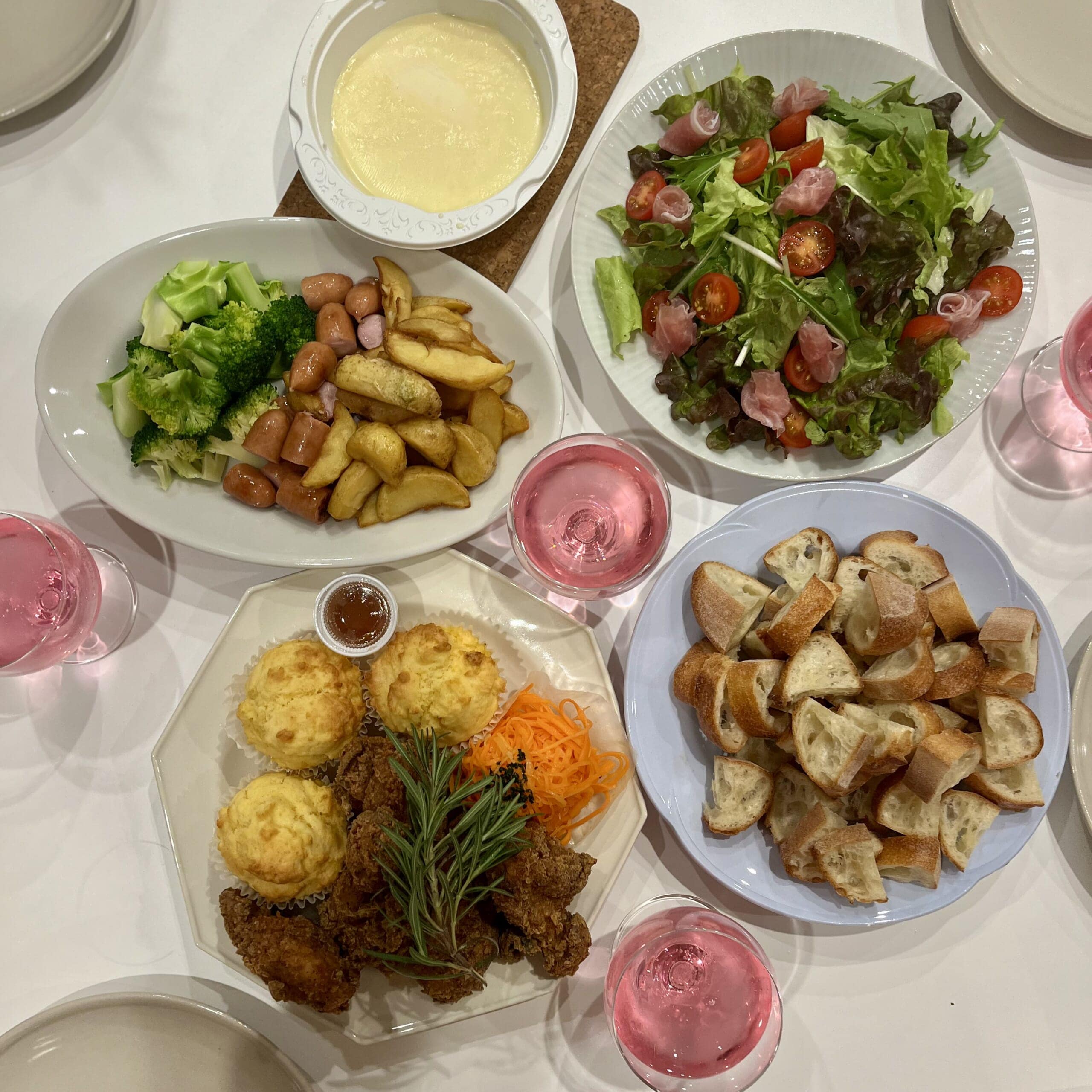 チキンの乗ったお皿はお店で買ったもの。(めちゃくちゃ美味しいです!)チーズフォンデュは電子レンジでチンするだけ。ということで、作ったのはサラダとチーズフォンデュのトッピングのみ。