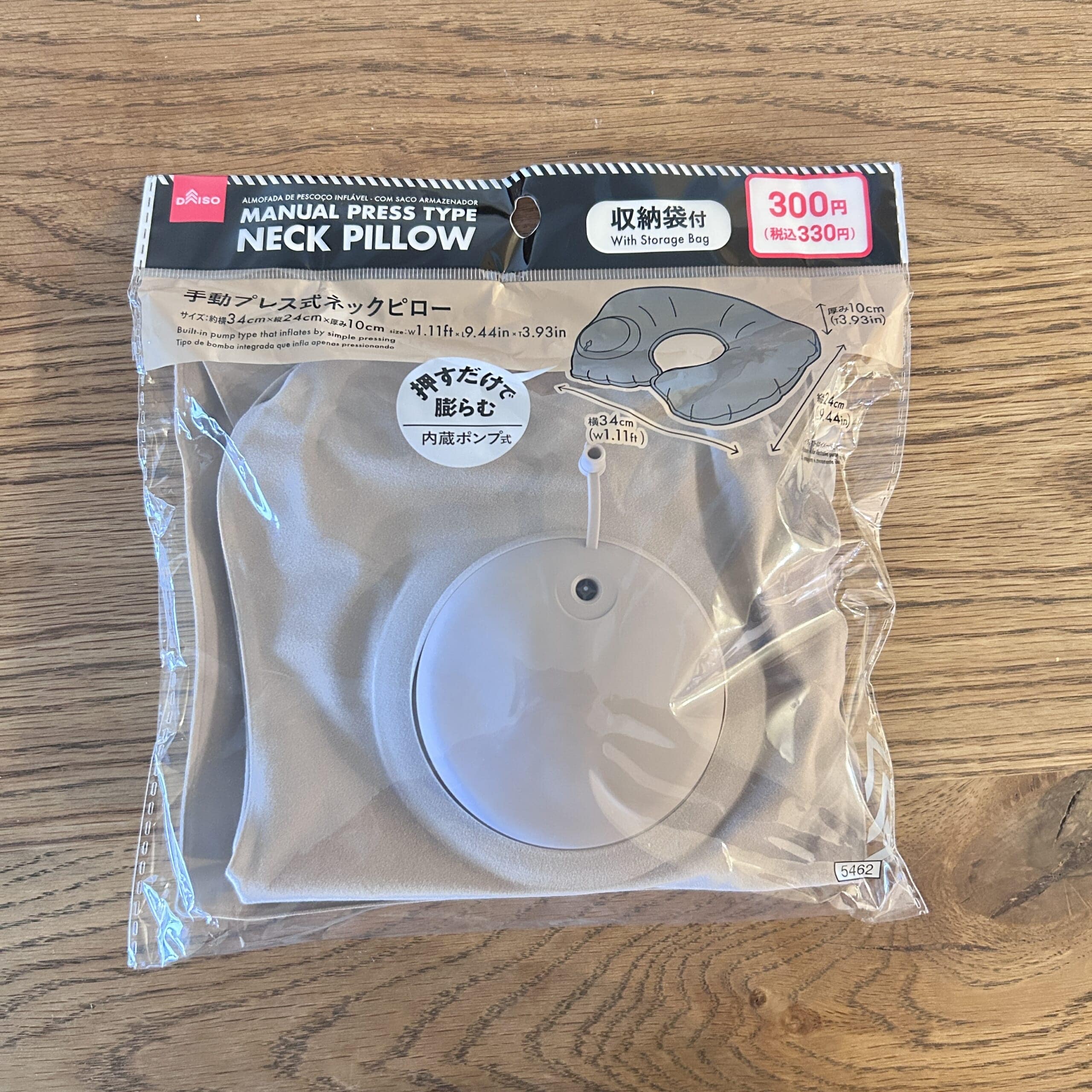 100円でも口で膨らますタイプはあったのですが、長時間フライトだしちょっとよさそうなやつにしてみました。