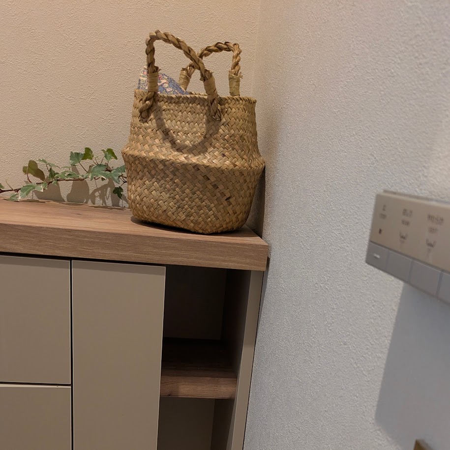 我が家は私以外は全員男家族なので、生理用品の収納も悩みましたが、ナチュラルな素材が好きなの絵こちらのかごに入れてウィリアムモリスのペーパーナフキンをかけて収納しています。布系をトイレに置きたくないので使い捨てできるのがペーパー素材ってありがたい♪